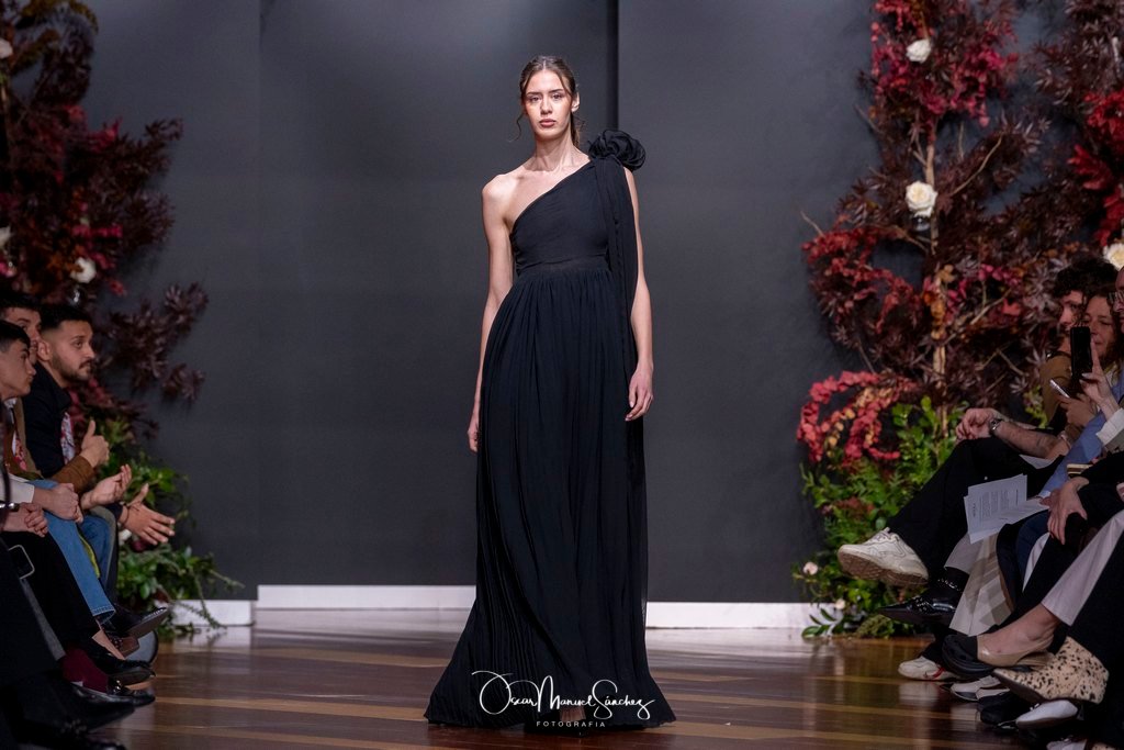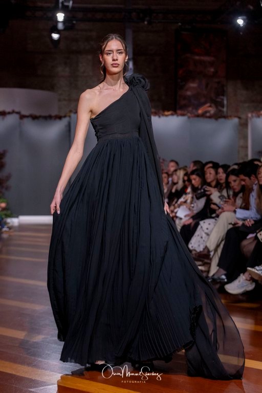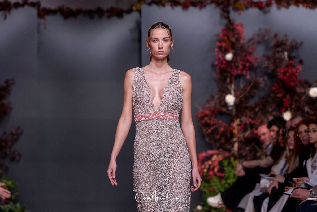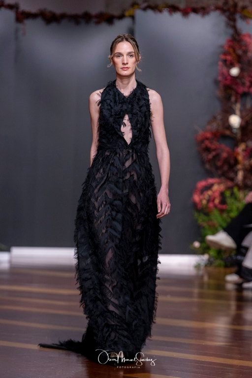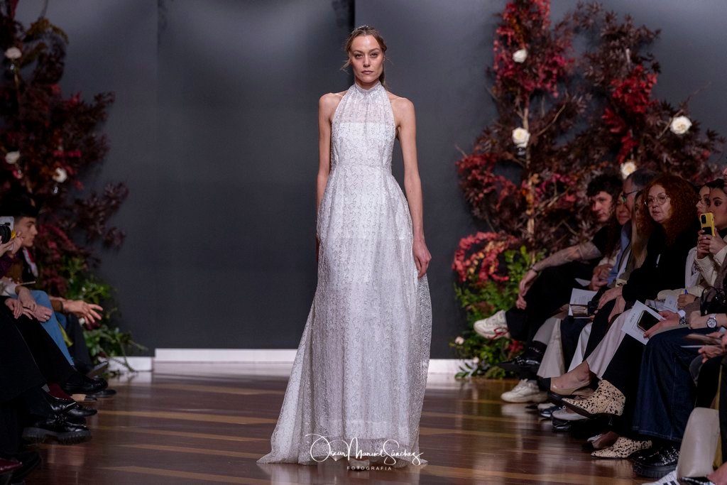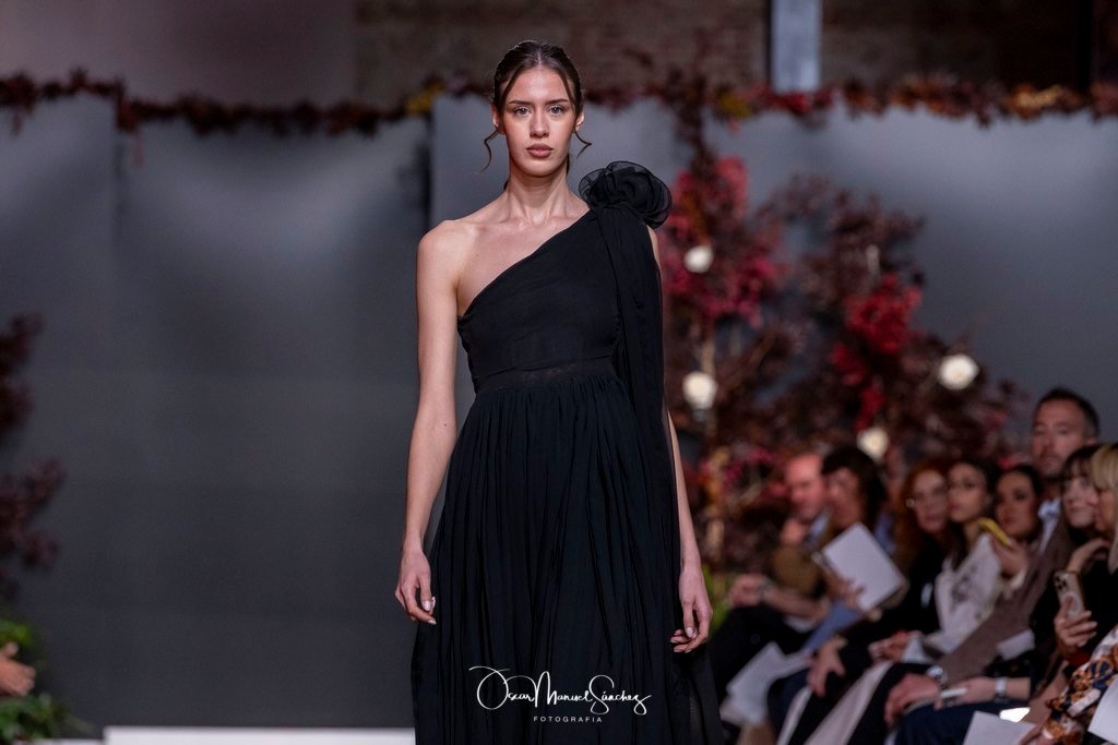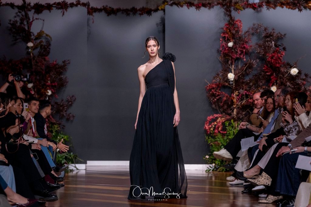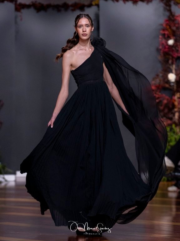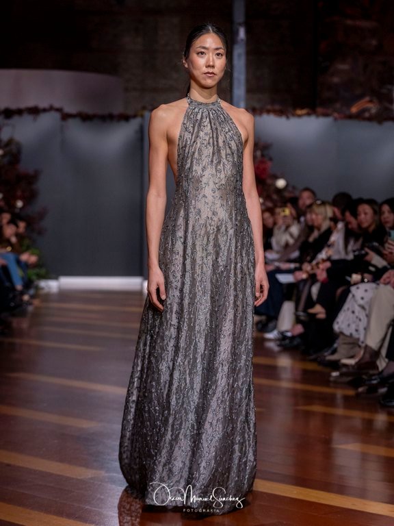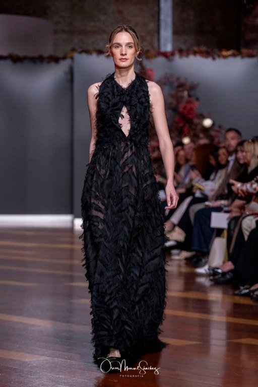 Las siluetas, de carácter escultórico, abrazan el torso con precisión arquitectónica. Los cuerpos se pliegan estratégicamente, liberando hombros y espaldas en un juego de sensualidad controlada. Las faldas amplían su volumen para dibujar una reinterpretación contemporánea de la silueta reloj de arena, mientras las transparencias aportan movimiento y un halo de misterio.