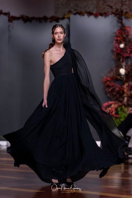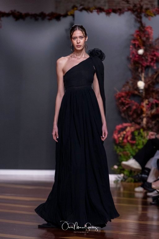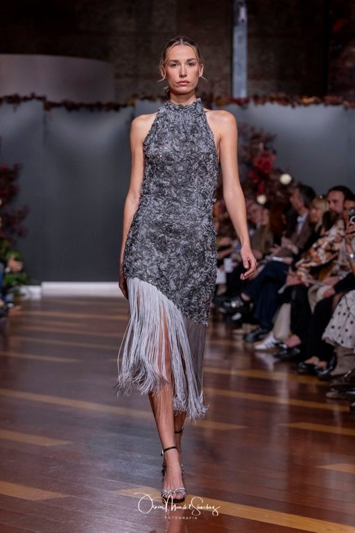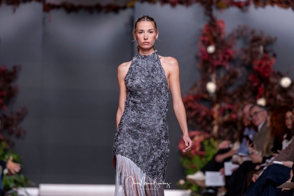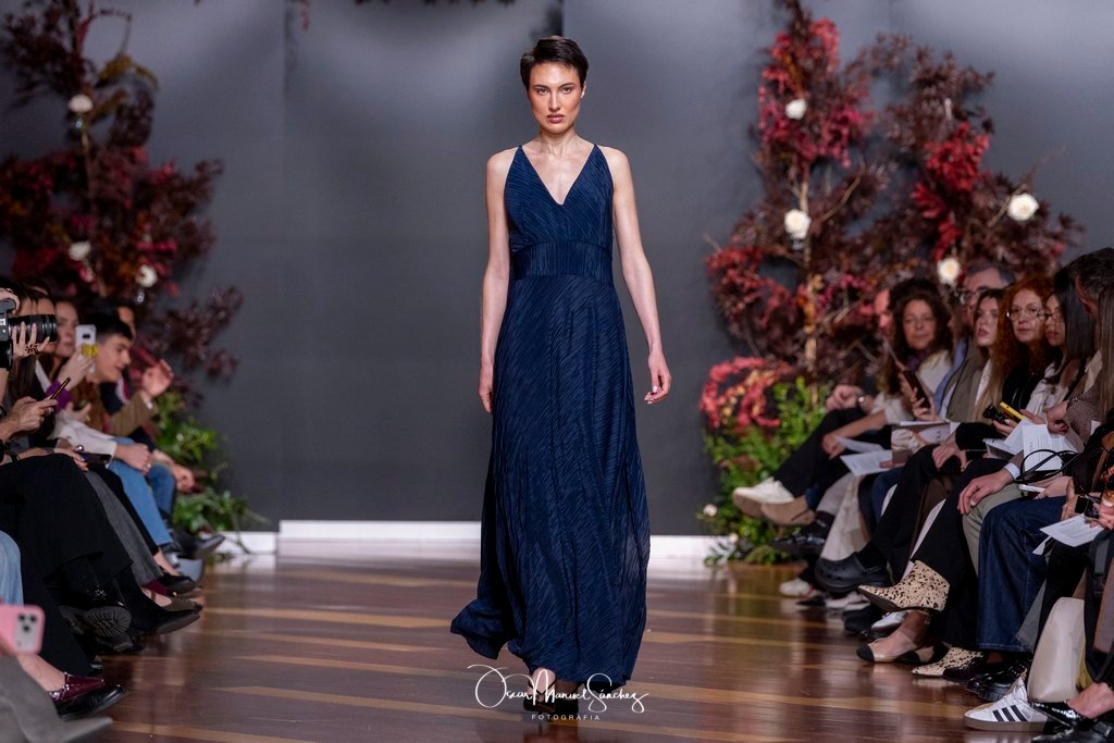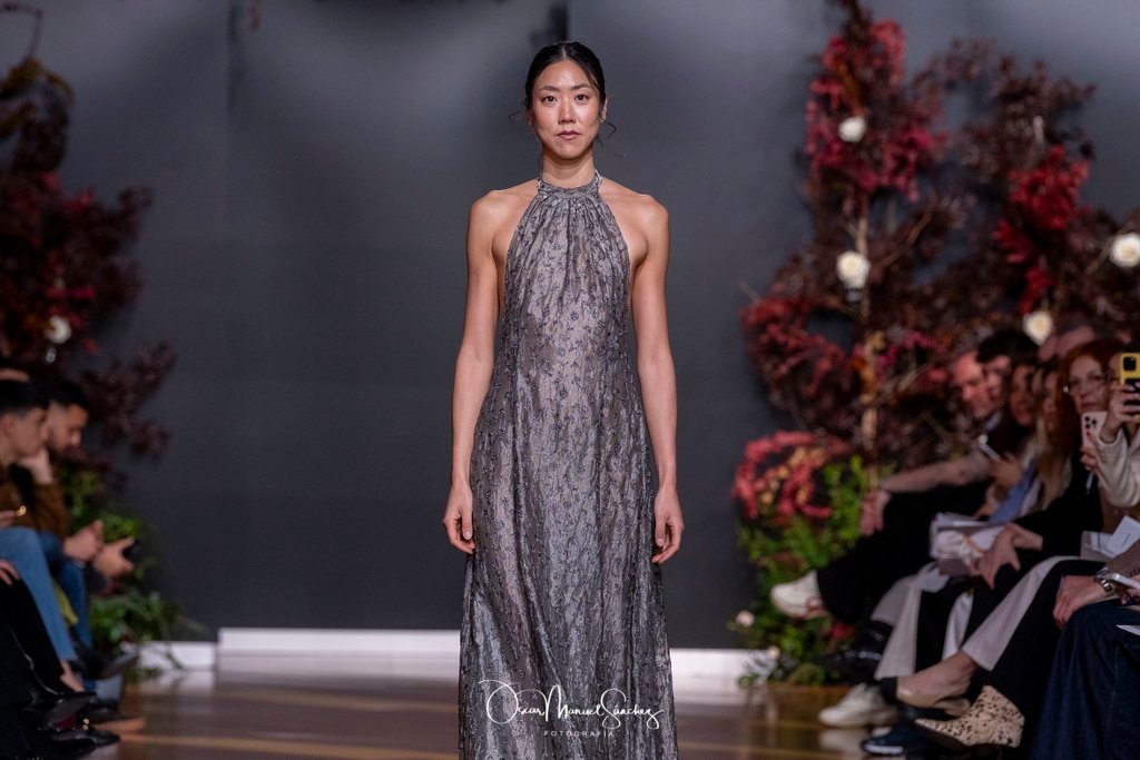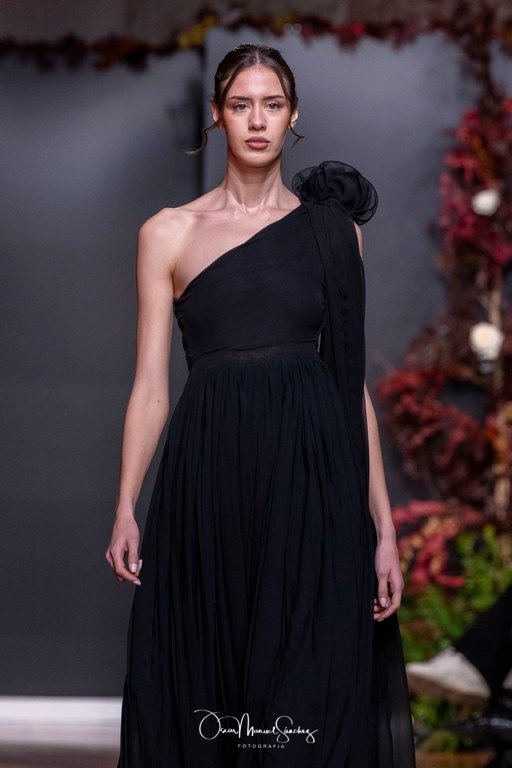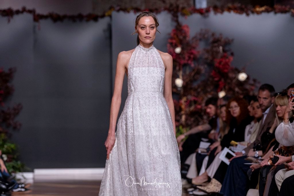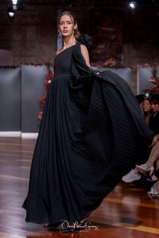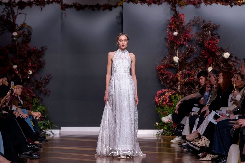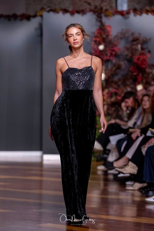 Las siluetas, de carácter escultórico, abrazan el torso con precisión arquitectónica. Los cuerpos se pliegan estratégicamente, liberando hombros y espaldas en un juego de sensualidad controlada. Las faldas amplían su volumen para dibujar una reinterpretación contemporánea de la silueta reloj de arena, mientras las transparencias aportan movimiento y un halo de misterio.