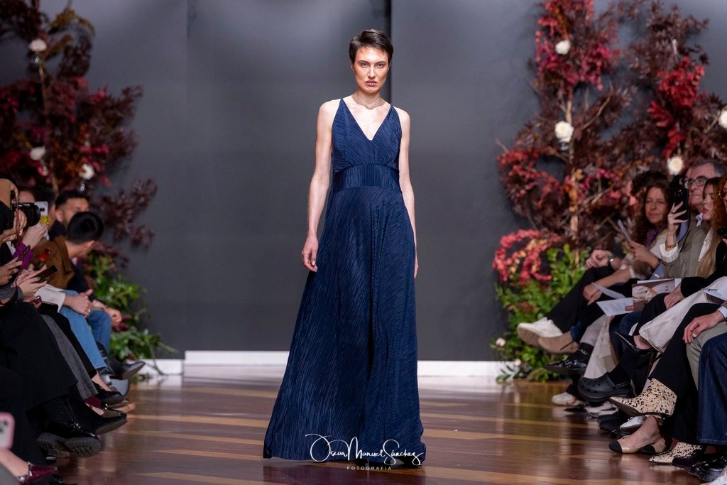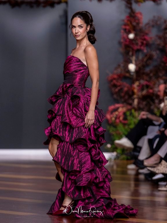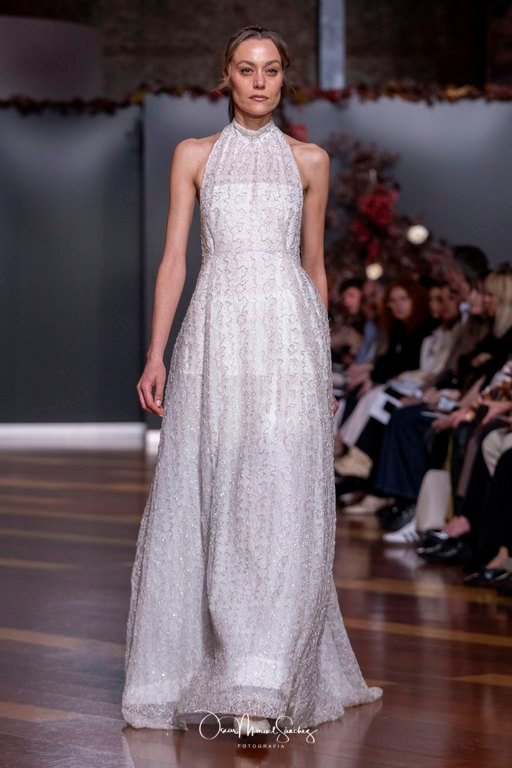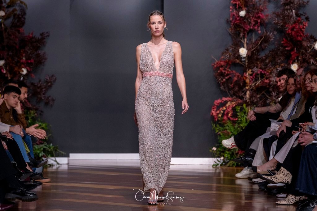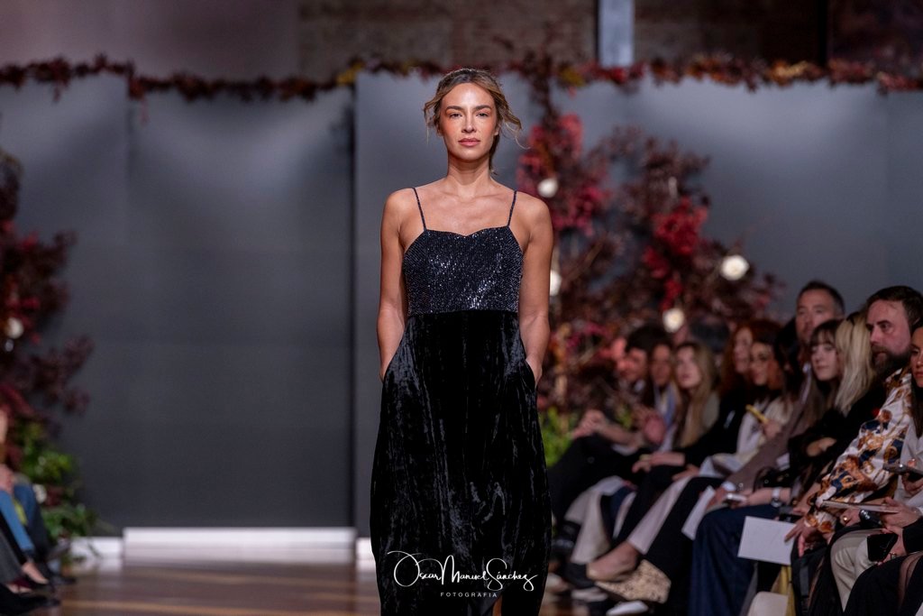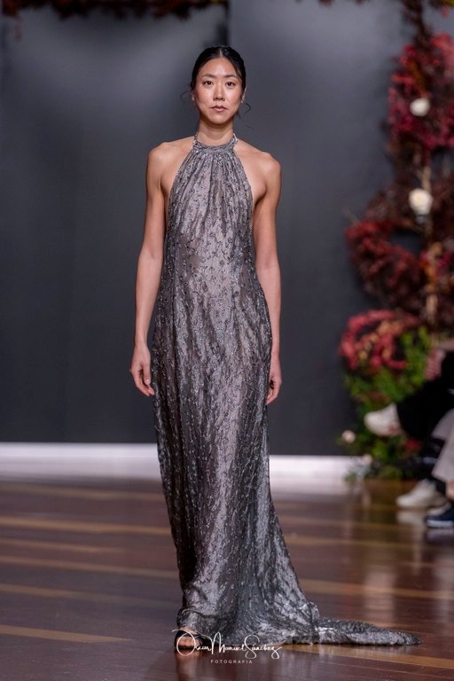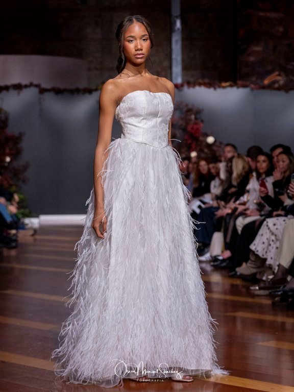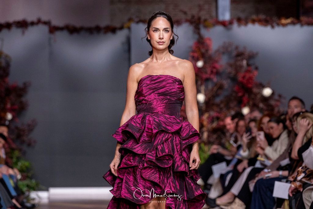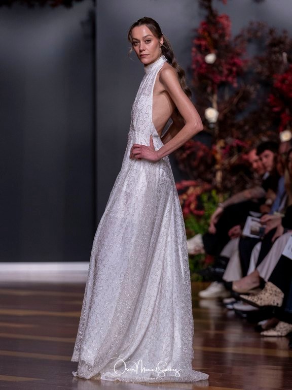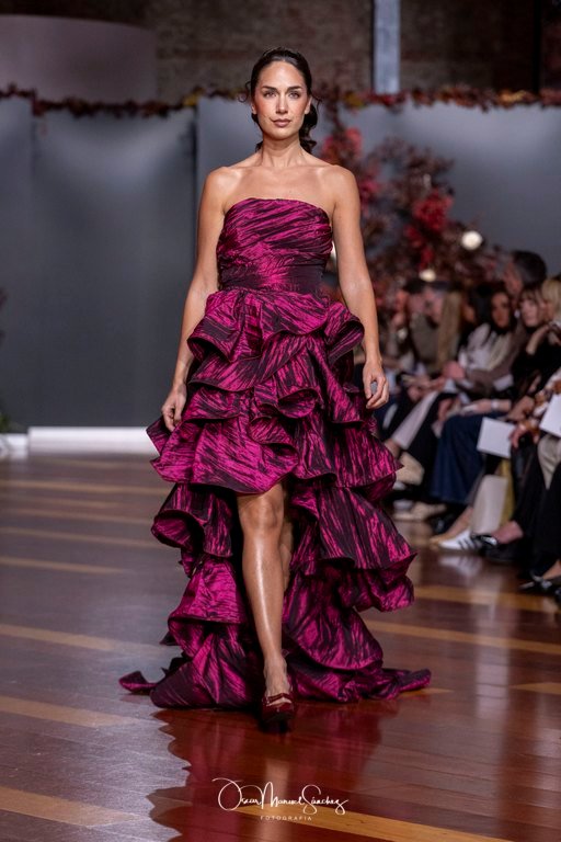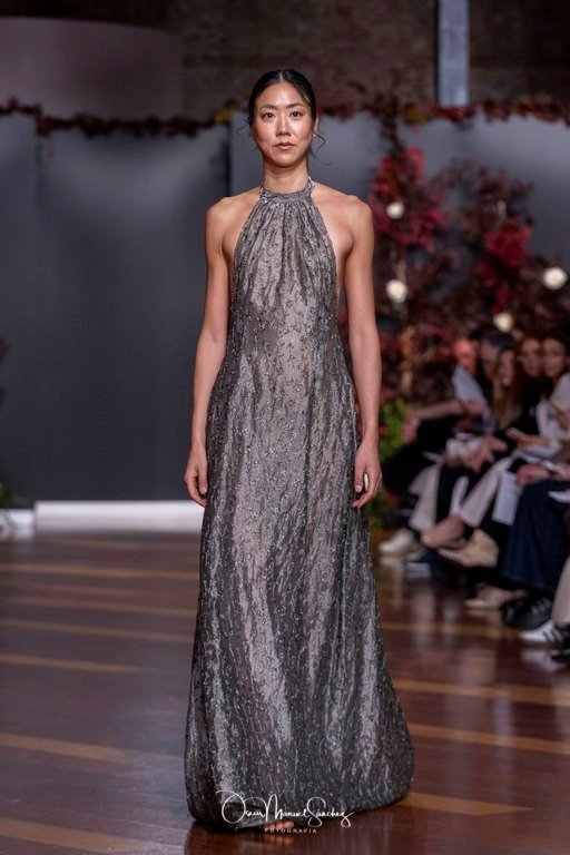 Las siluetas, de carácter escultórico, abrazan el torso con precisión arquitectónica. Los cuerpos se pliegan estratégicamente, liberando hombros y espaldas en un juego de sensualidad controlada. Las faldas amplían su volumen para dibujar una reinterpretación contemporánea de la silueta reloj de arena, mientras las transparencias aportan movimiento y un halo de misterio.