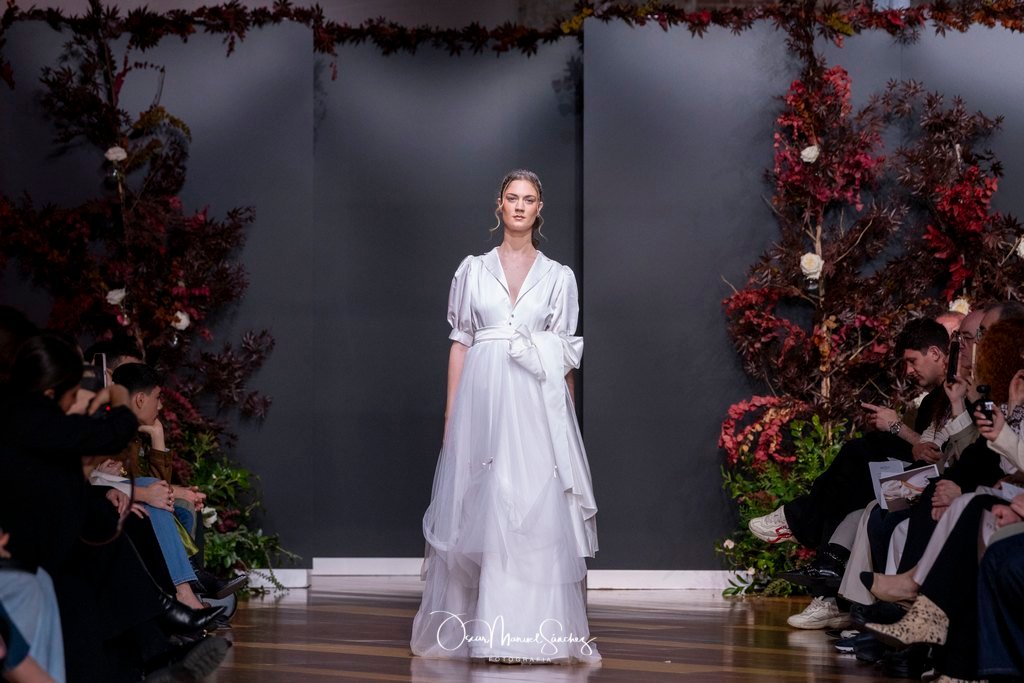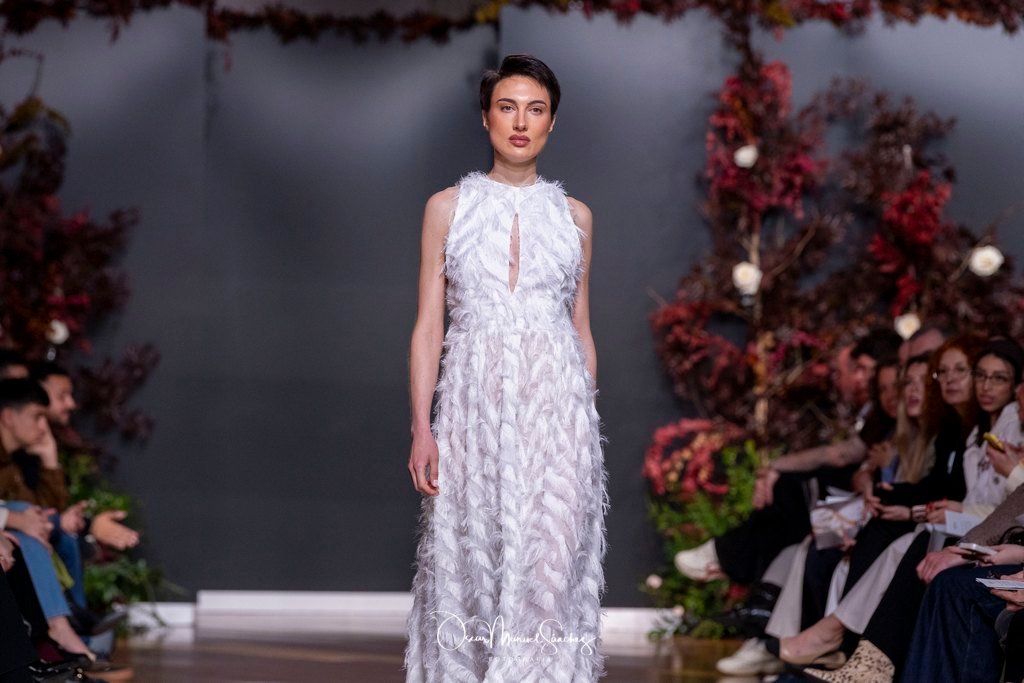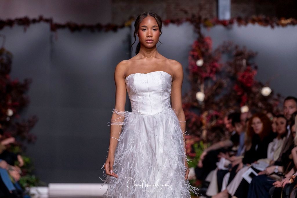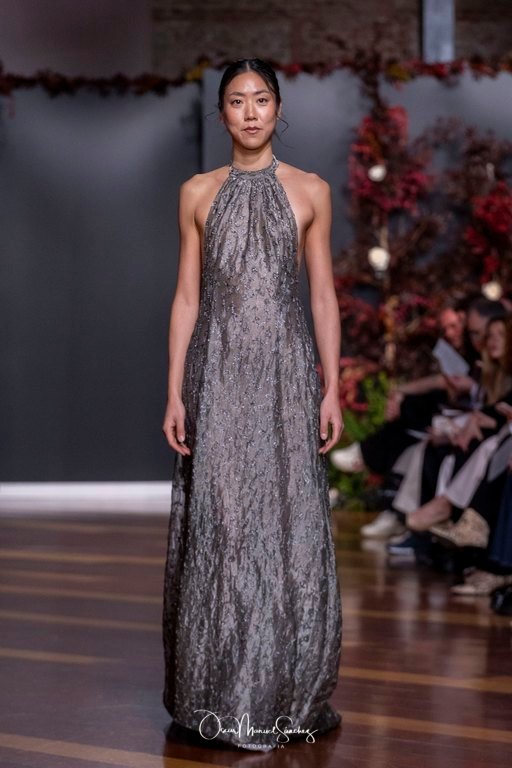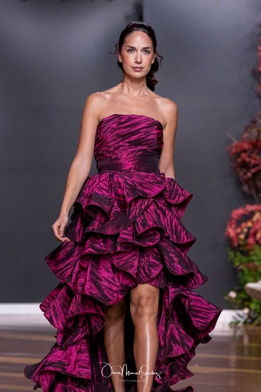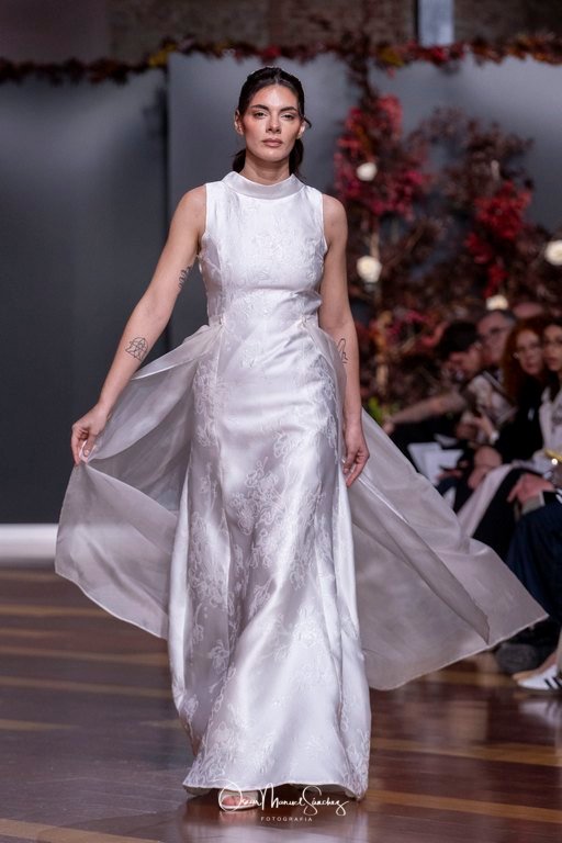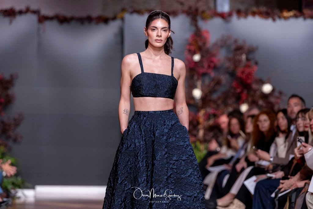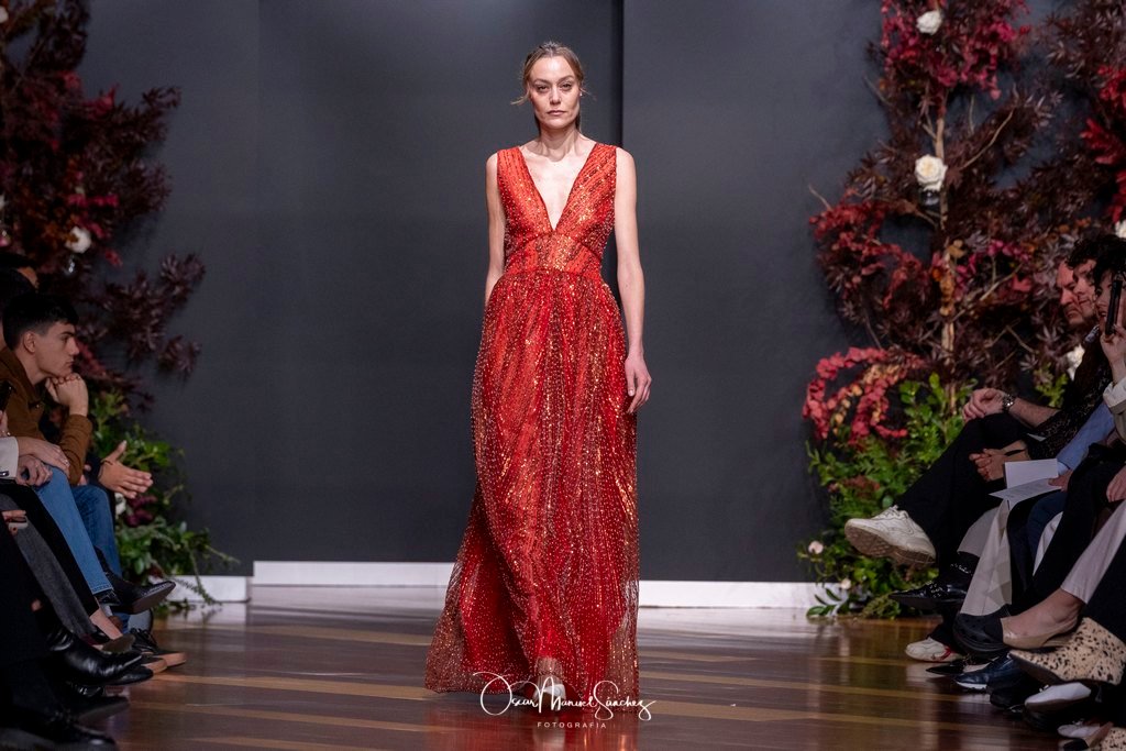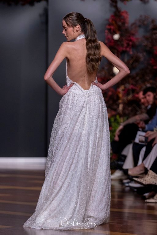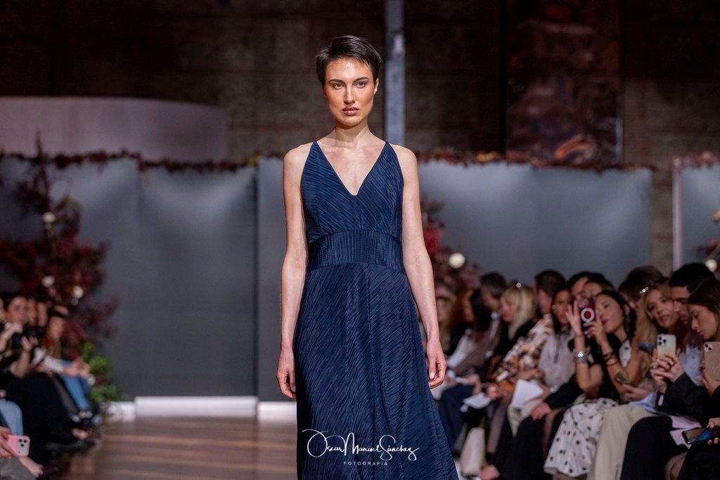 Las siluetas, de carácter escultórico, abrazan el torso con precisión arquitectónica. Los cuerpos se pliegan estratégicamente, liberando hombros y espaldas en un juego de sensualidad controlada. Las faldas amplían su volumen para dibujar una reinterpretación contemporánea de la silueta reloj de arena, mientras las transparencias aportan movimiento y un halo de misterio.