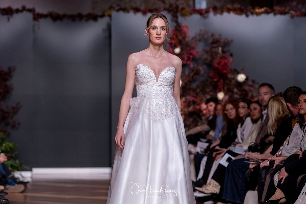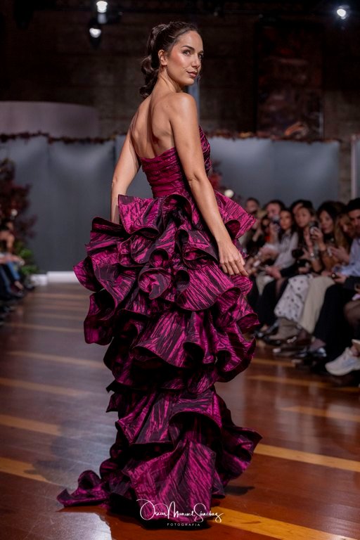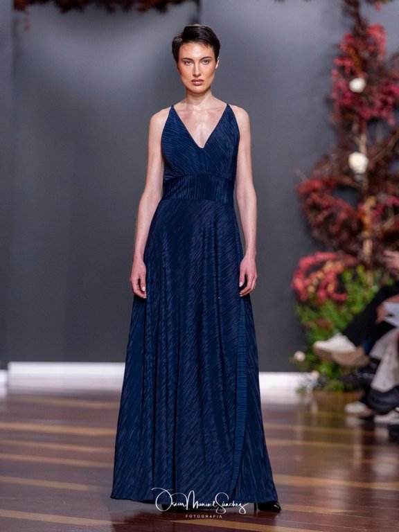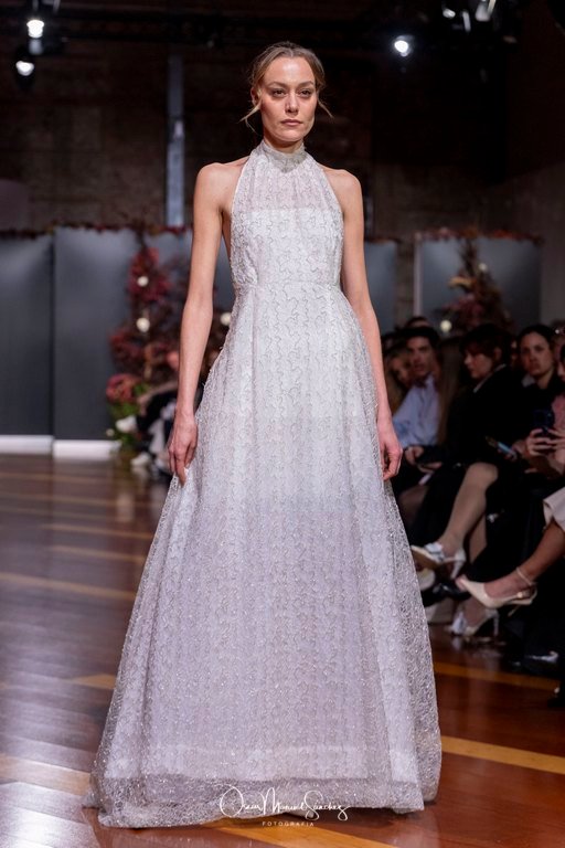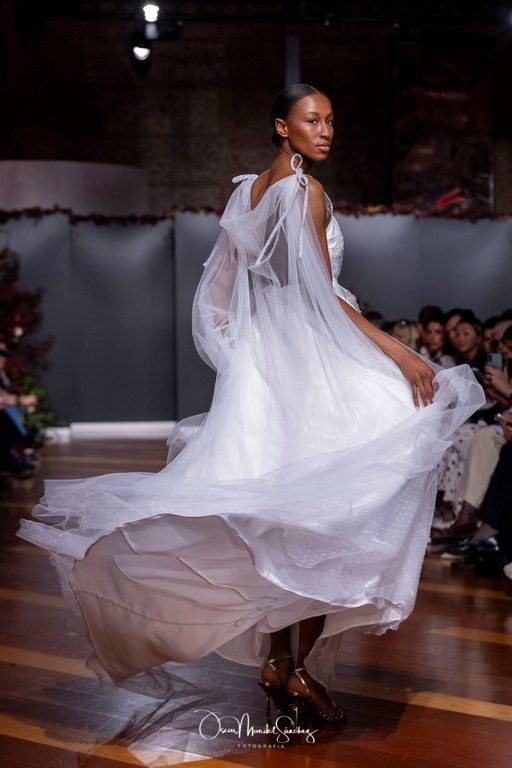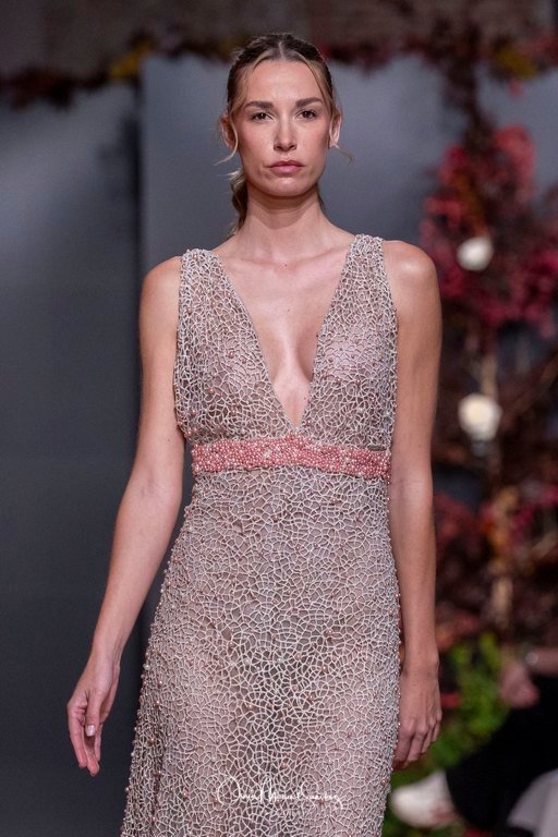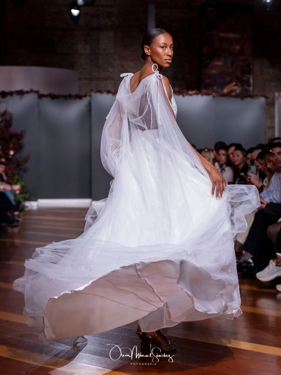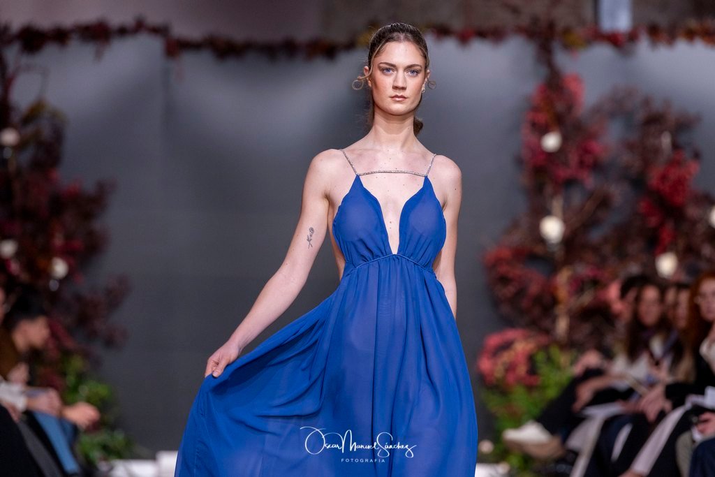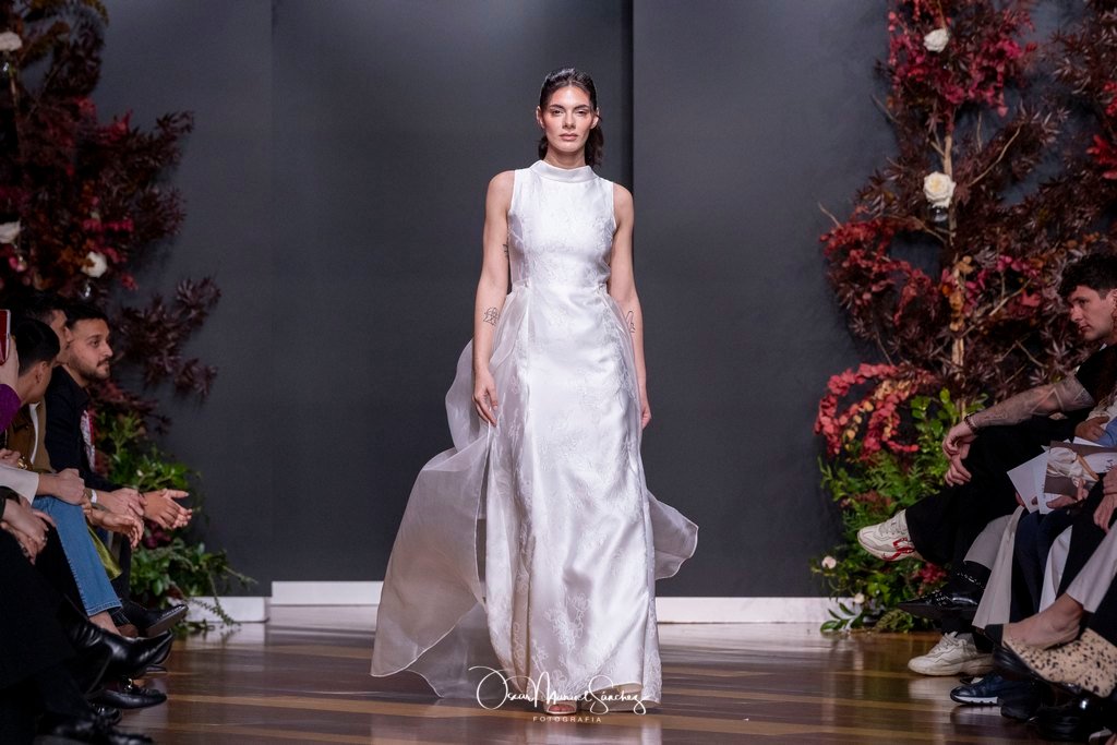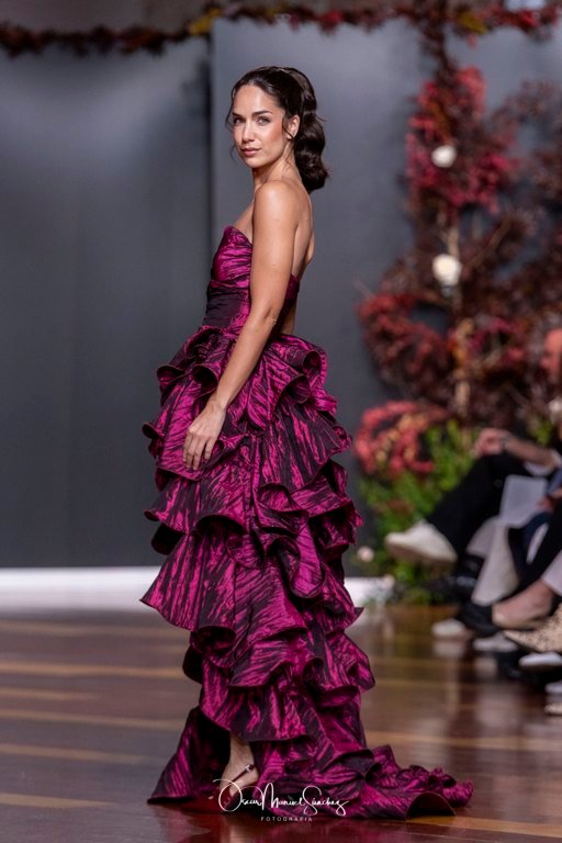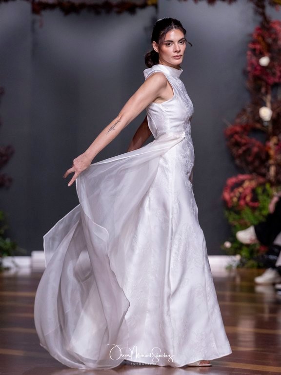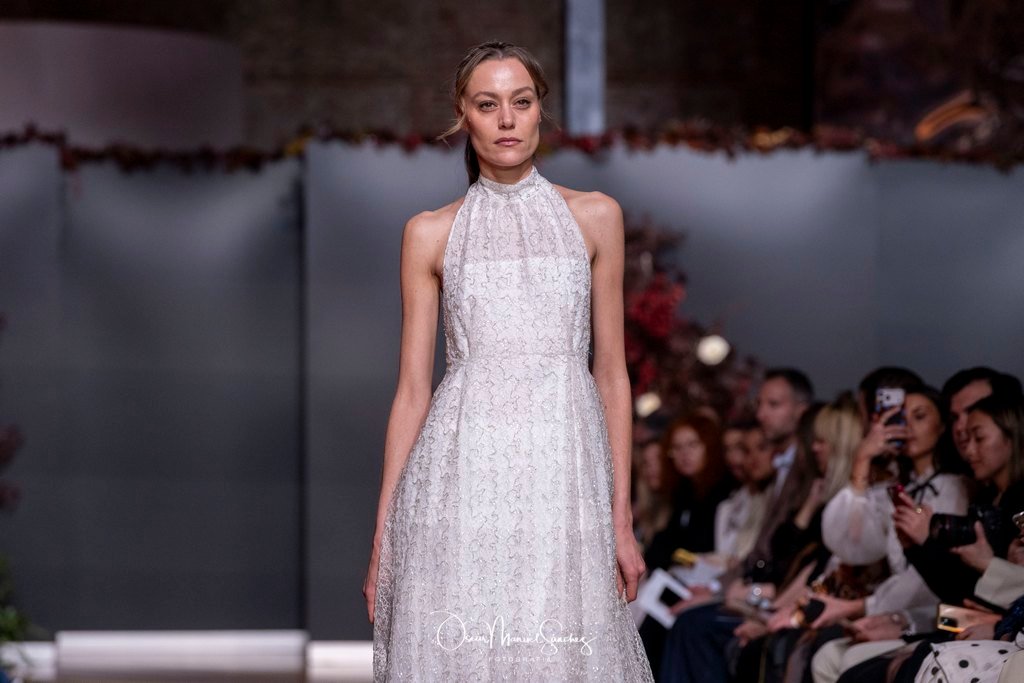 Las siluetas, de carácter escultórico, abrazan el torso con precisión arquitectónica. Los cuerpos se pliegan estratégicamente, liberando hombros y espaldas en un juego de sensualidad controlada. Las faldas amplían su volumen para dibujar una reinterpretación contemporánea de la silueta reloj de arena, mientras las transparencias aportan movimiento y un halo de misterio.