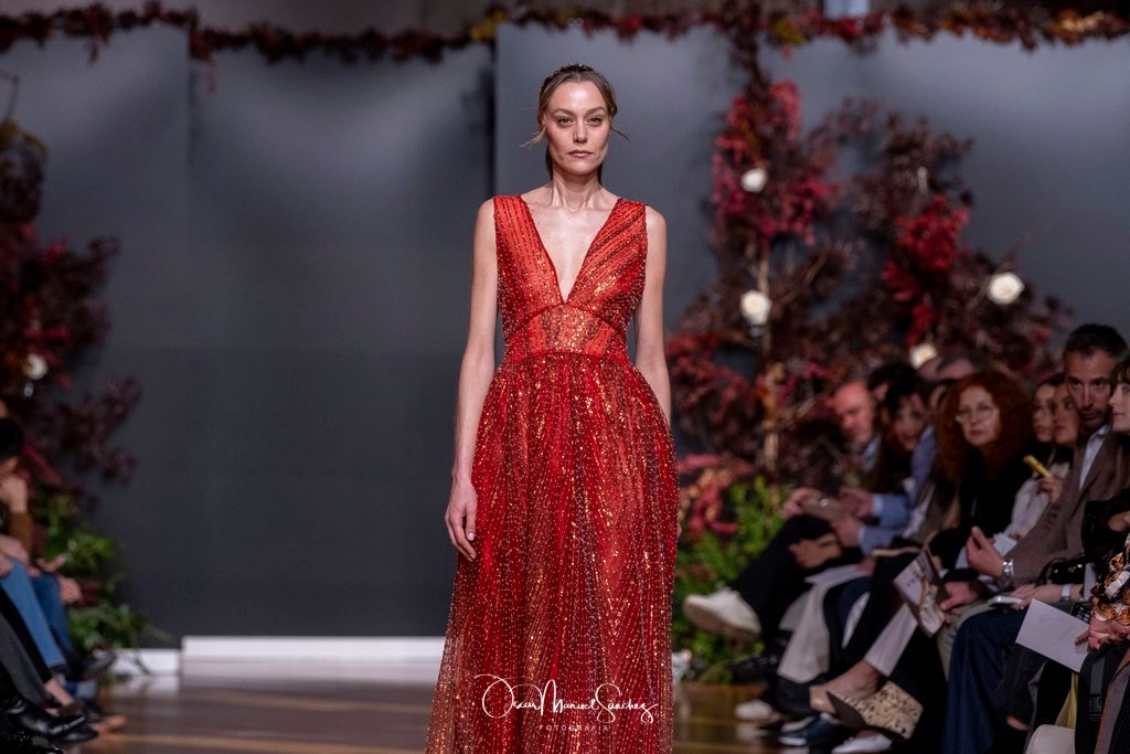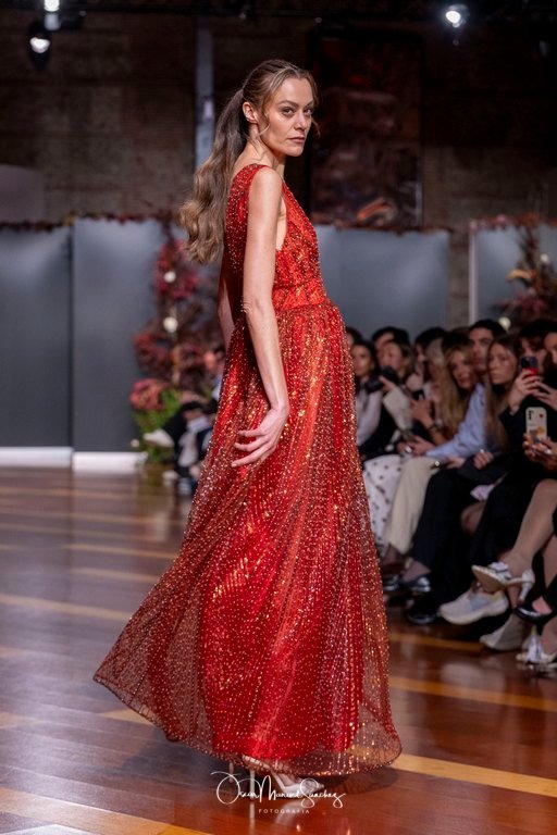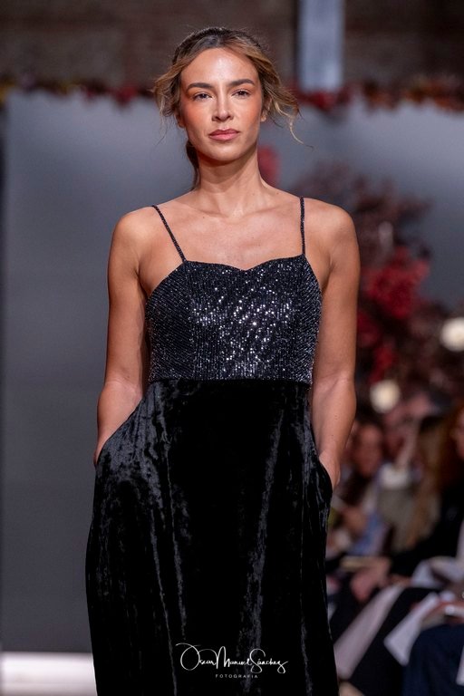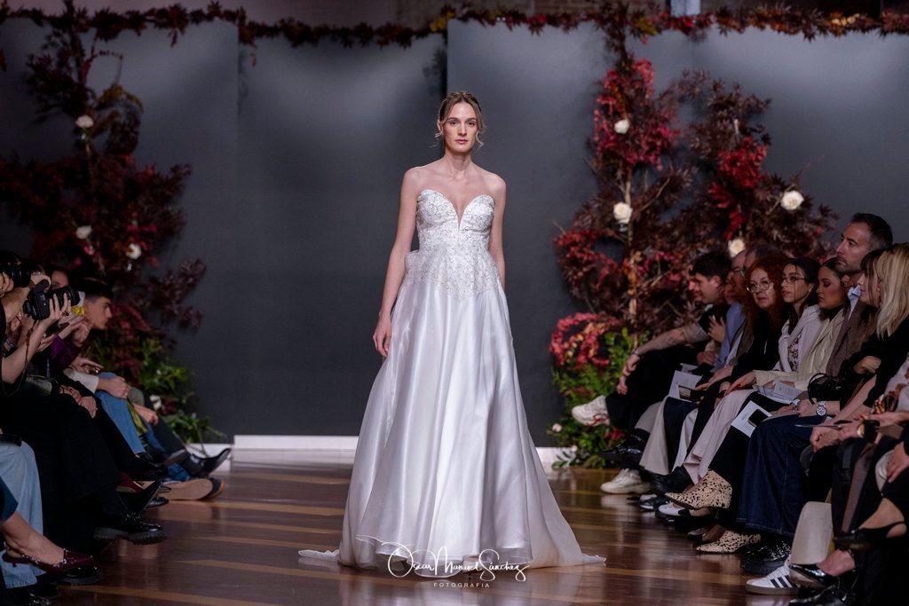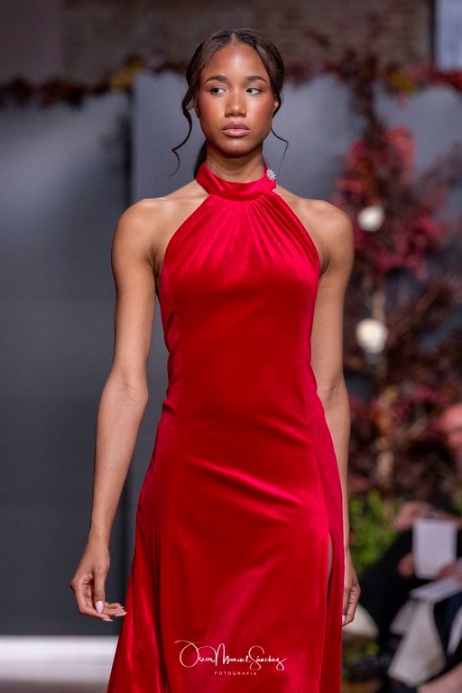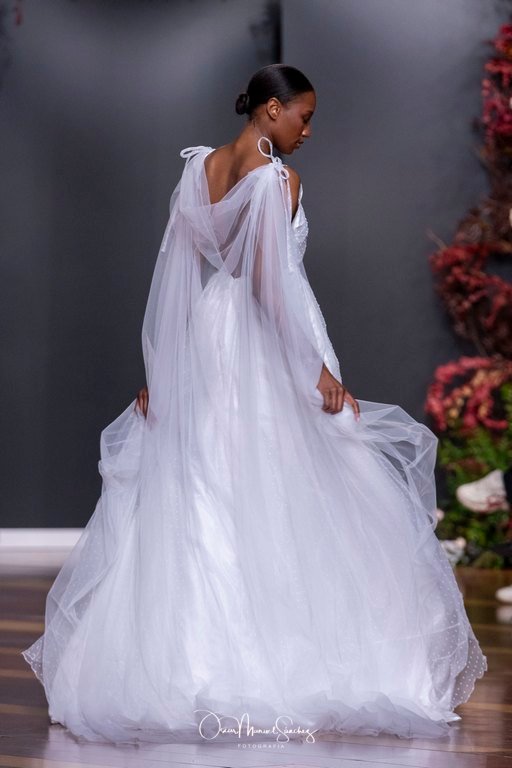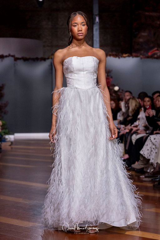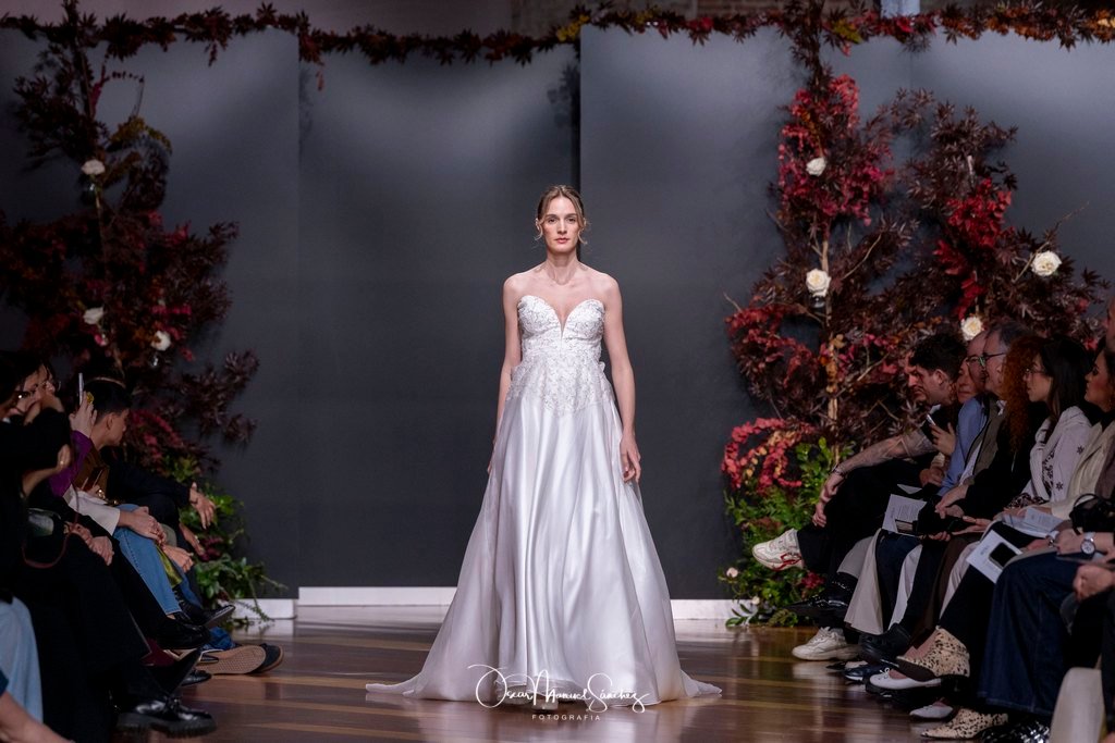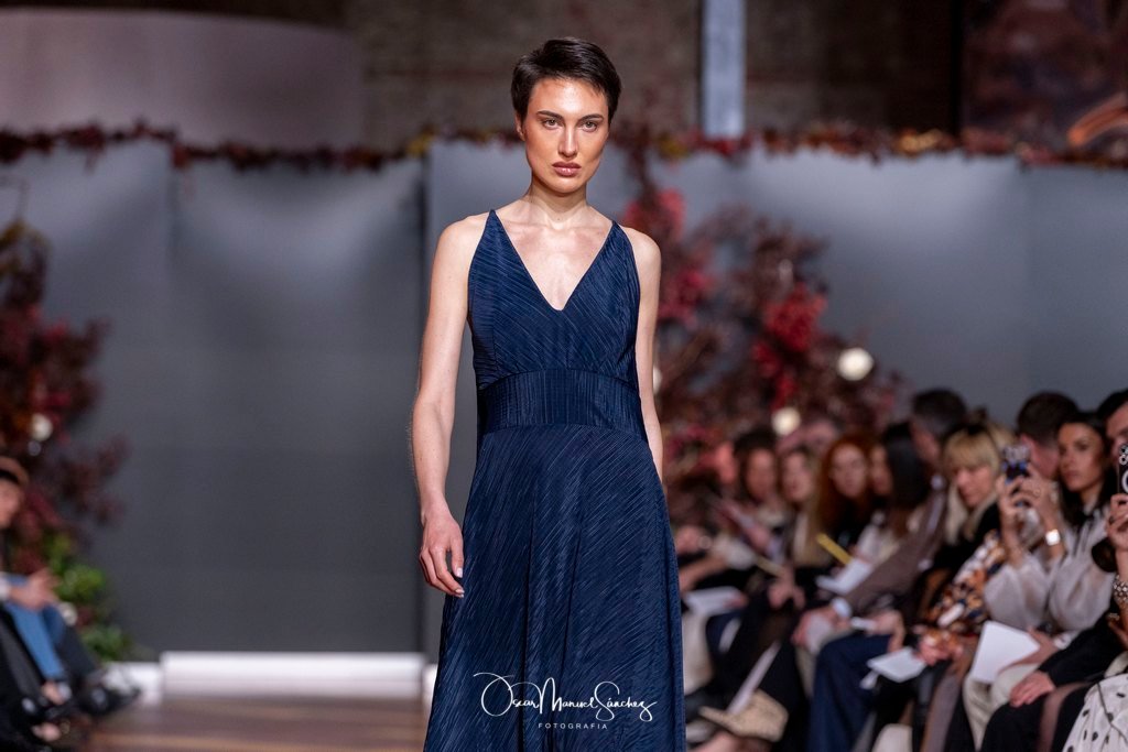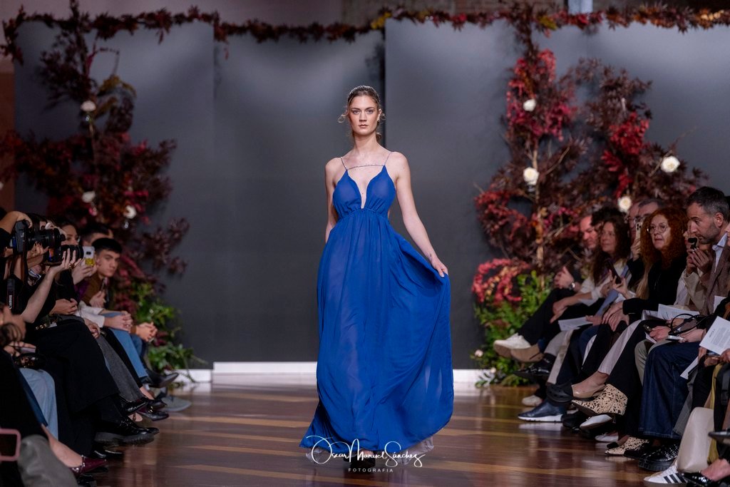 Las siluetas, de carácter escultórico, abrazan el torso con precisión arquitectónica. Los cuerpos se pliegan estratégicamente, liberando hombros y espaldas en un juego de sensualidad controlada. Las faldas amplían su volumen para dibujar una reinterpretación contemporánea de la silueta reloj de arena, mientras las transparencias aportan movimiento y un halo de misterio.