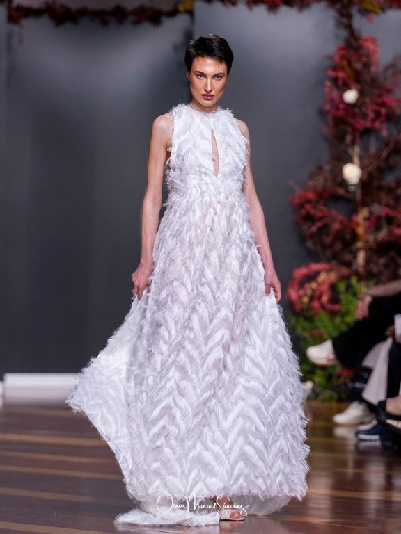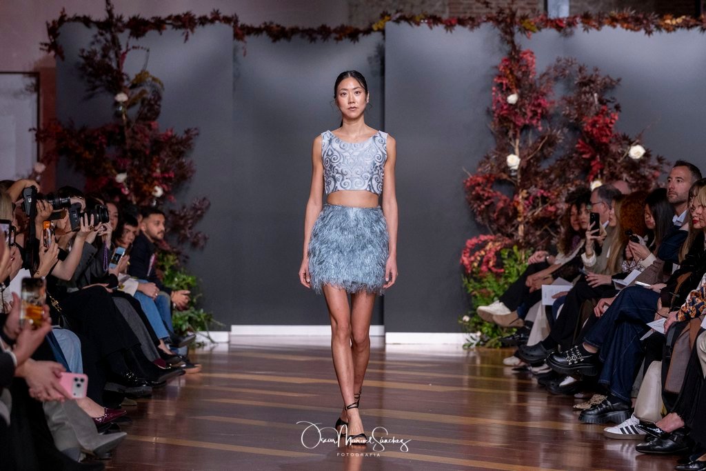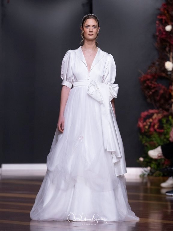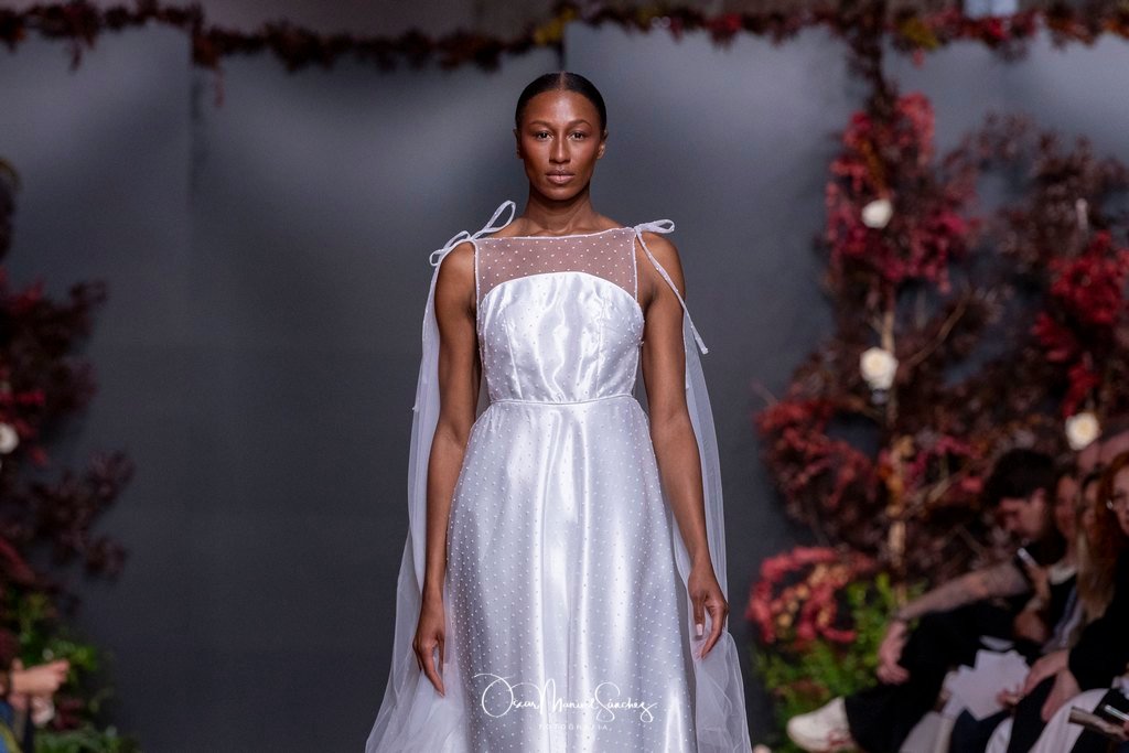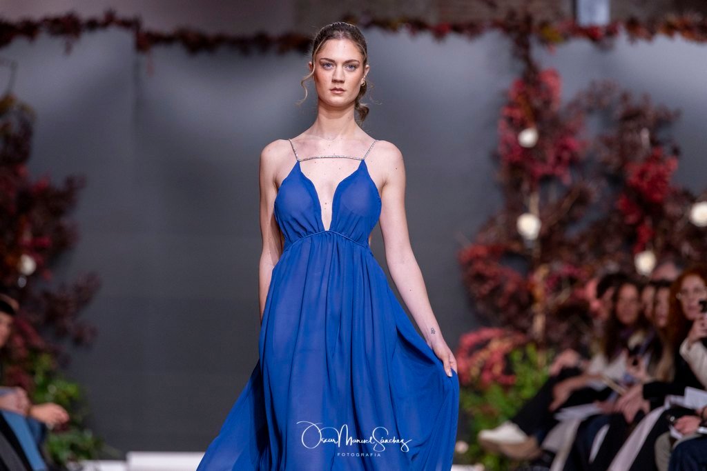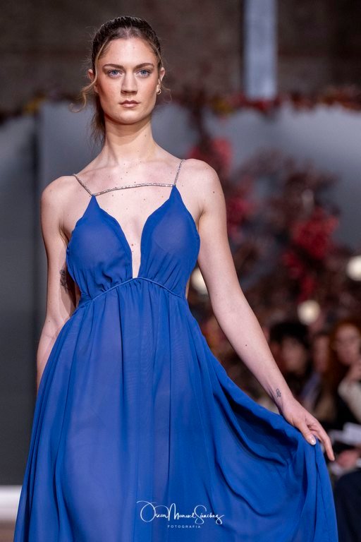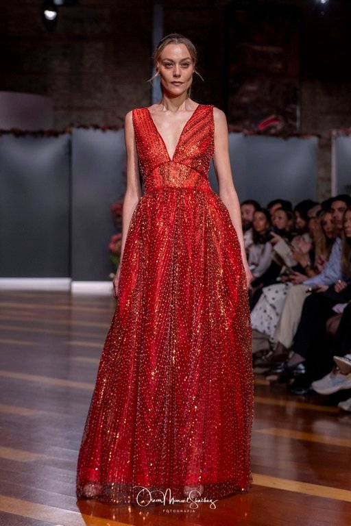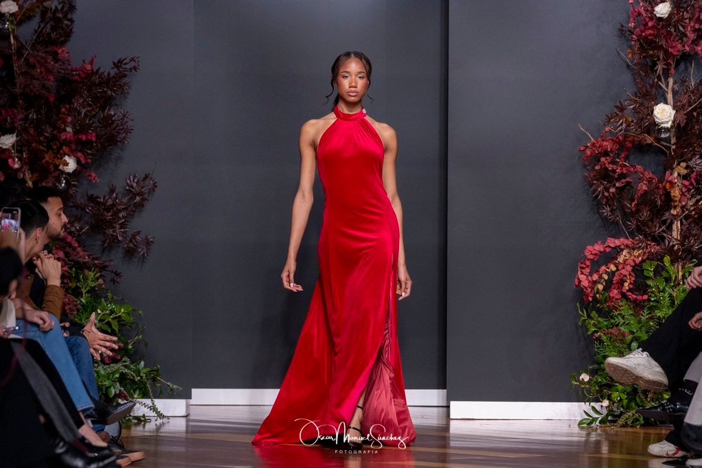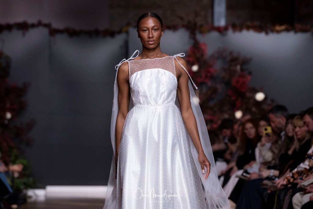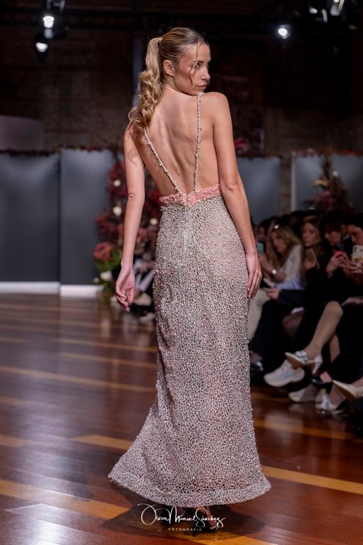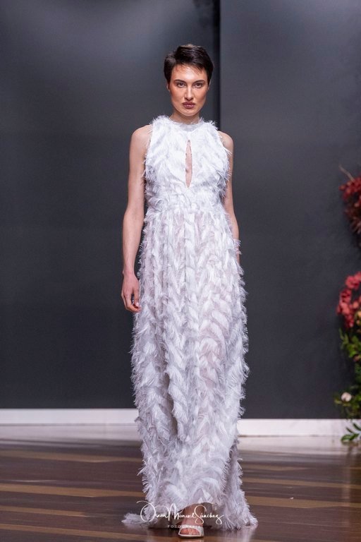 Las siluetas, de carácter escultórico, abrazan el torso con precisión arquitectónica. Los cuerpos se pliegan estratégicamente, liberando hombros y espaldas en un juego de sensualidad controlada. Las faldas amplían su volumen para dibujar una reinterpretación contemporánea de la silueta reloj de arena, mientras las transparencias aportan movimiento y un halo de misterio.