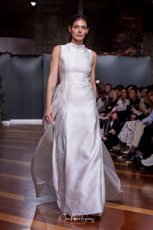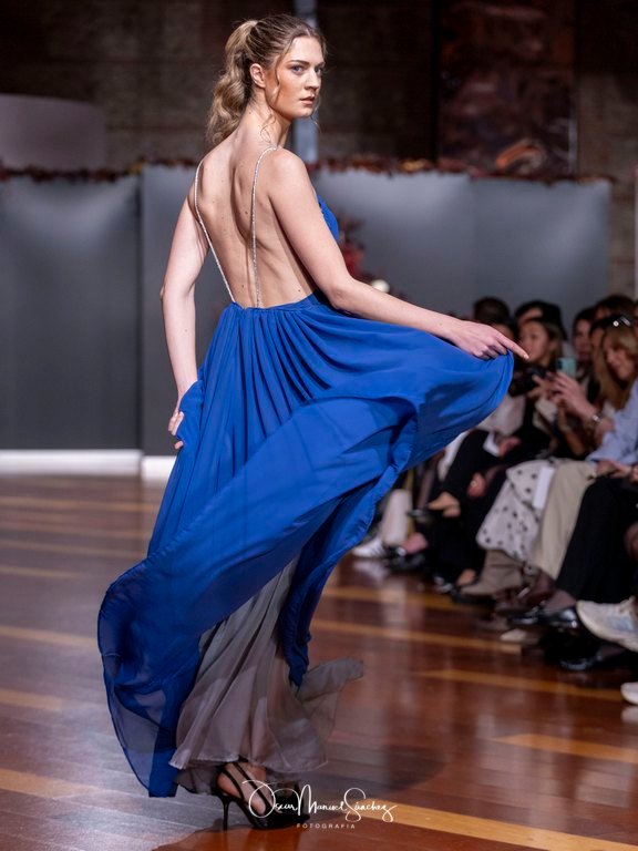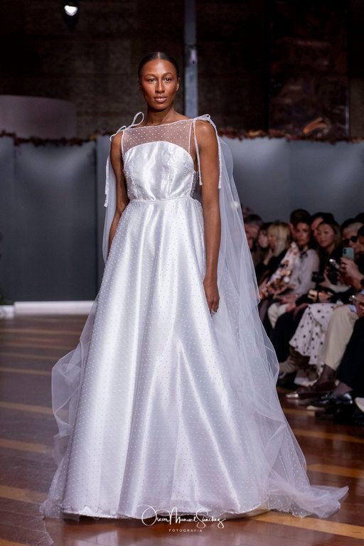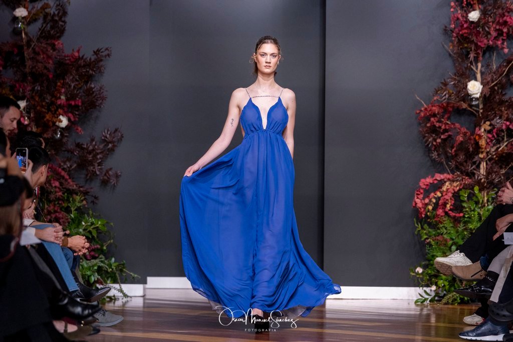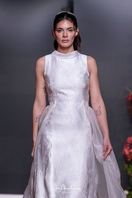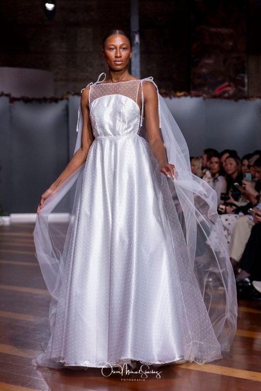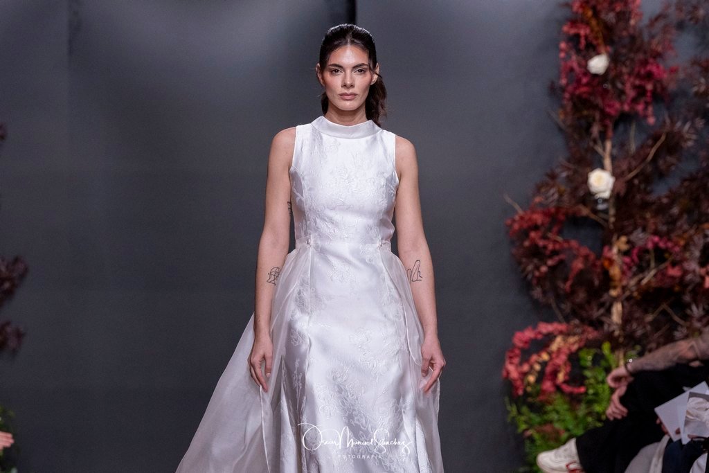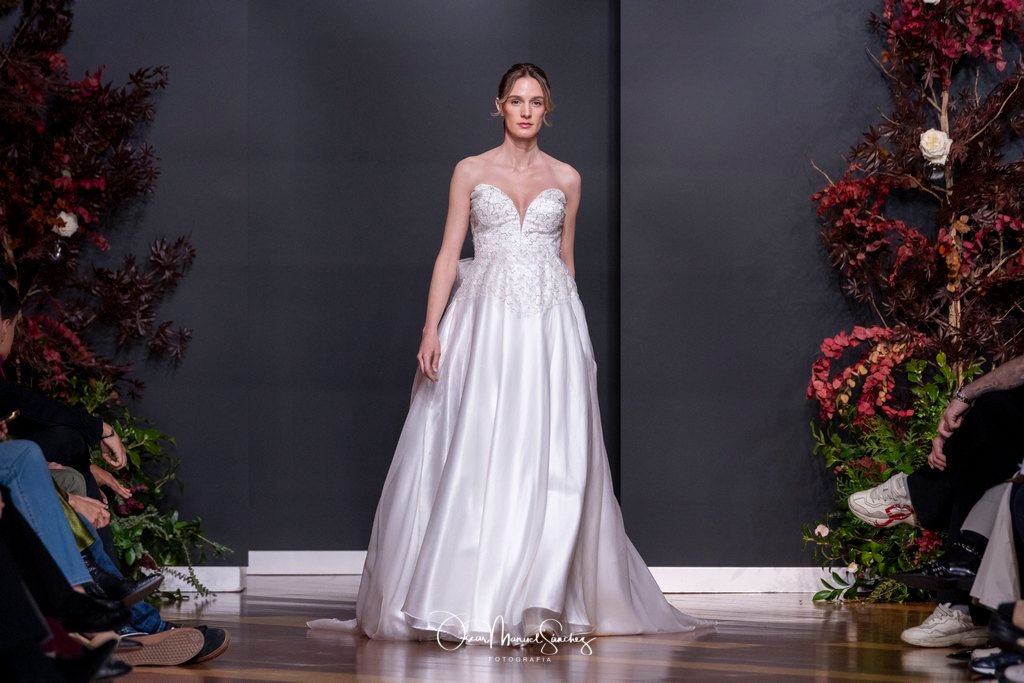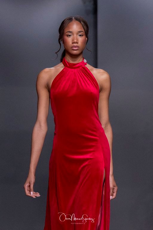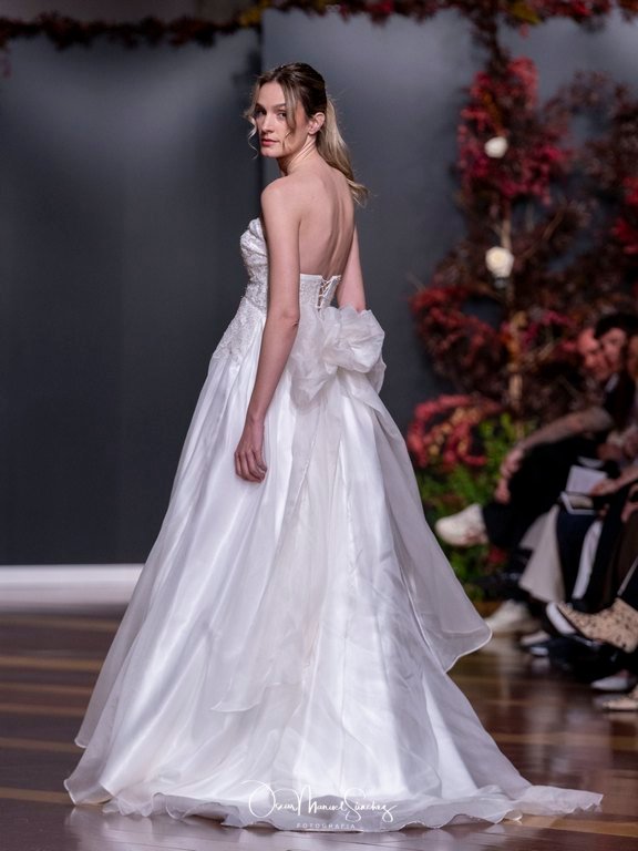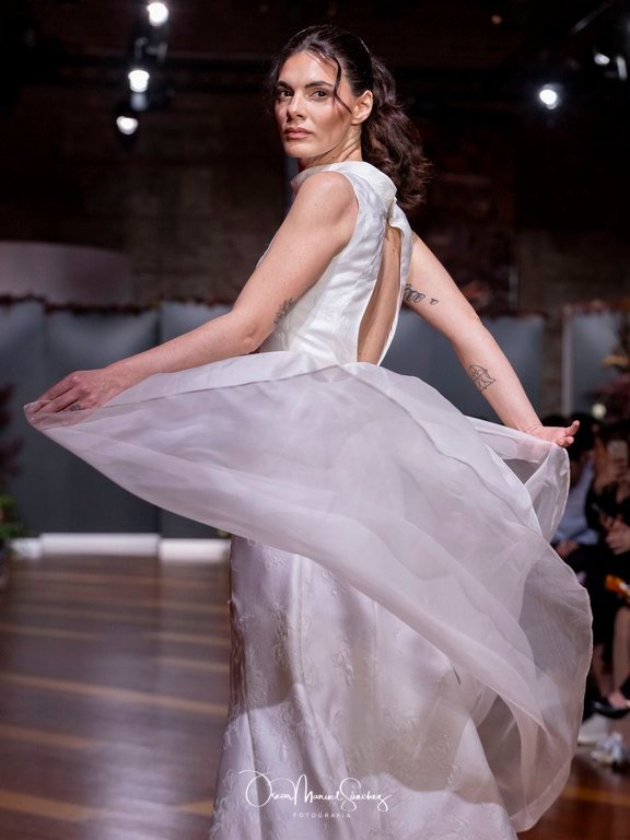 Las siluetas, de carácter escultórico, abrazan el torso con precisión arquitectónica. Los cuerpos se pliegan estratégicamente, liberando hombros y espaldas en un juego de sensualidad controlada. Las faldas amplían su volumen para dibujar una reinterpretación contemporánea de la silueta reloj de arena, mientras las transparencias aportan movimiento y un halo de misterio.