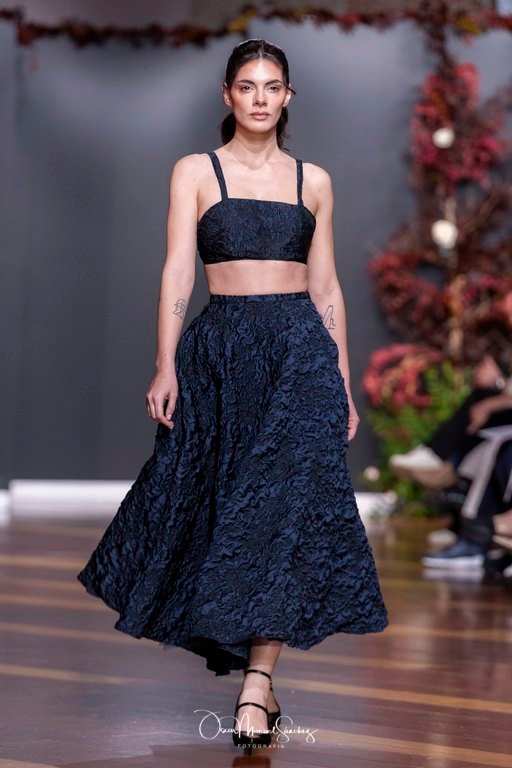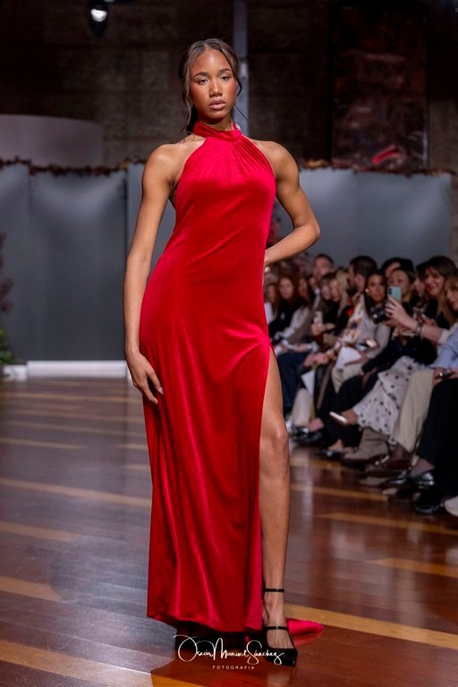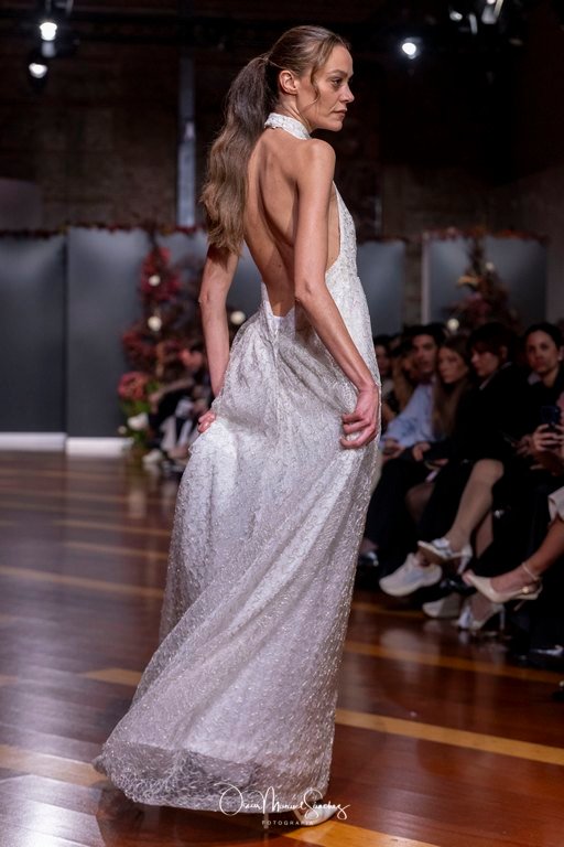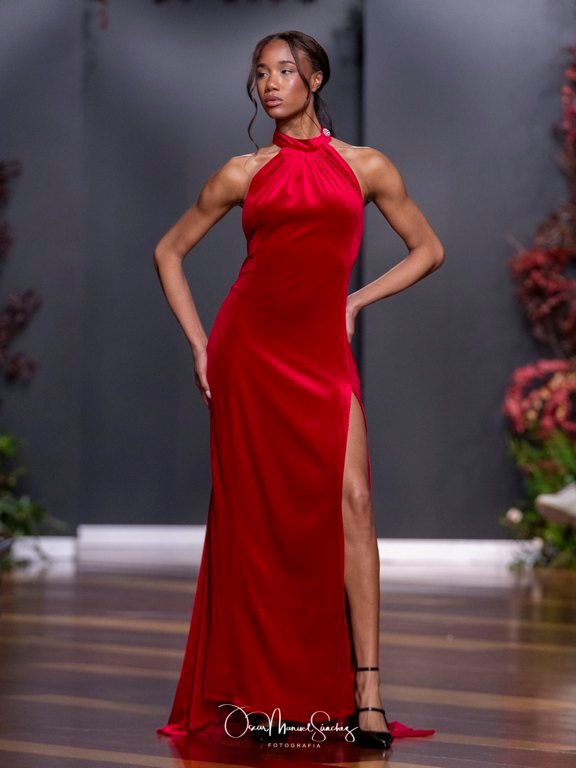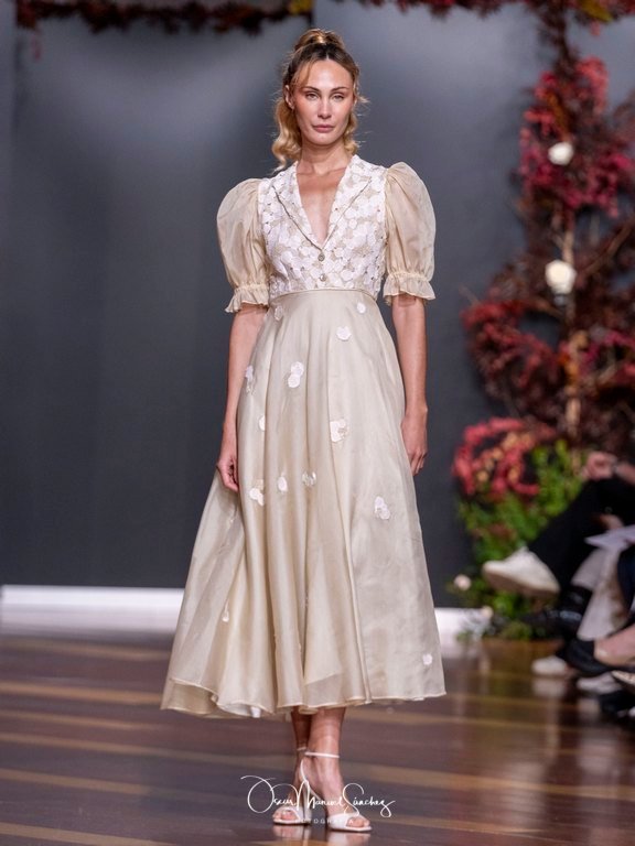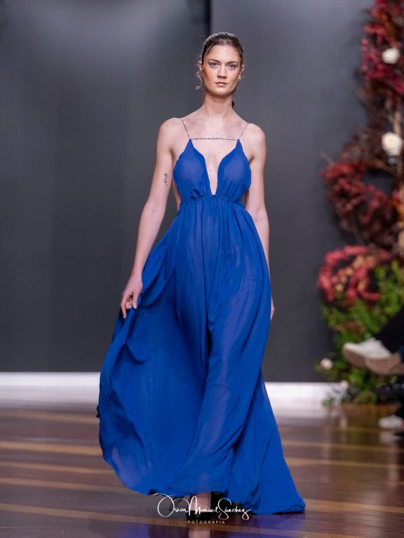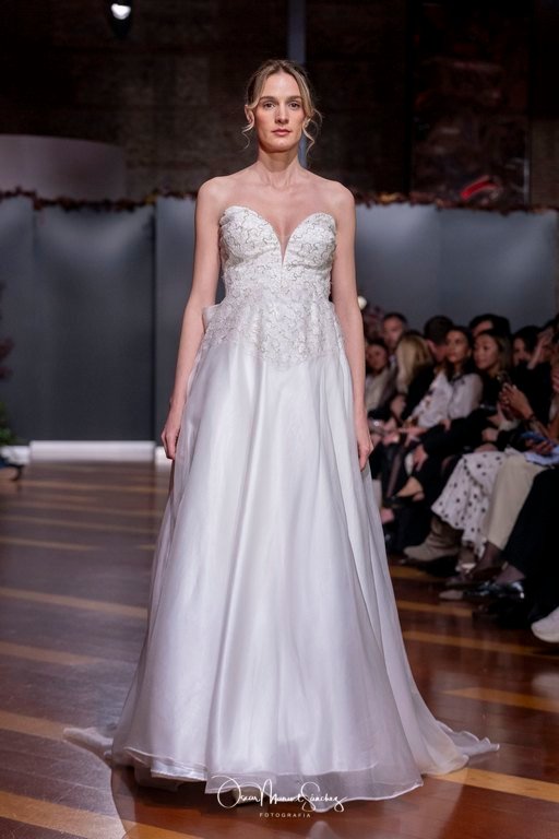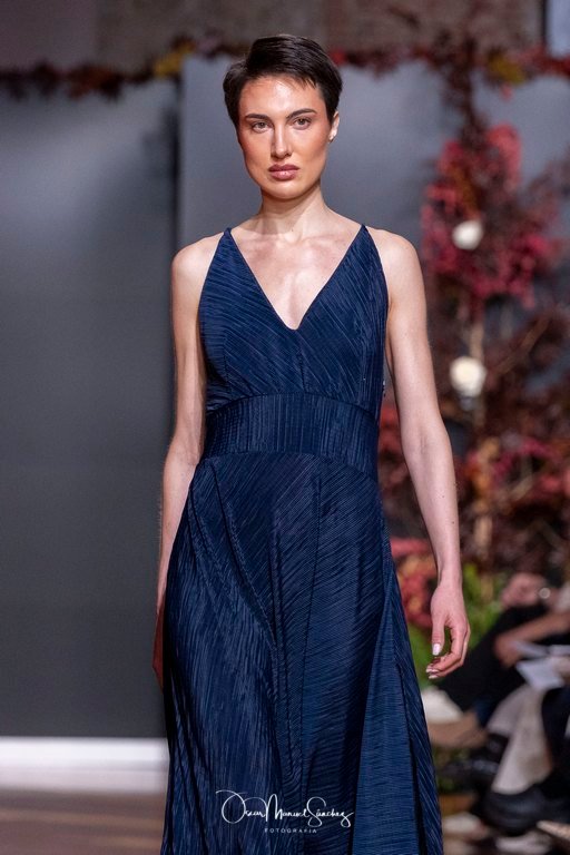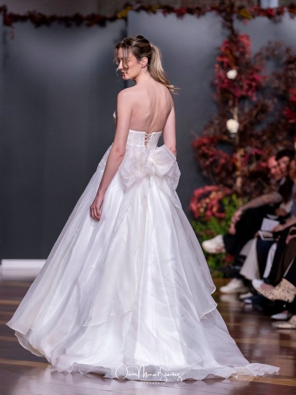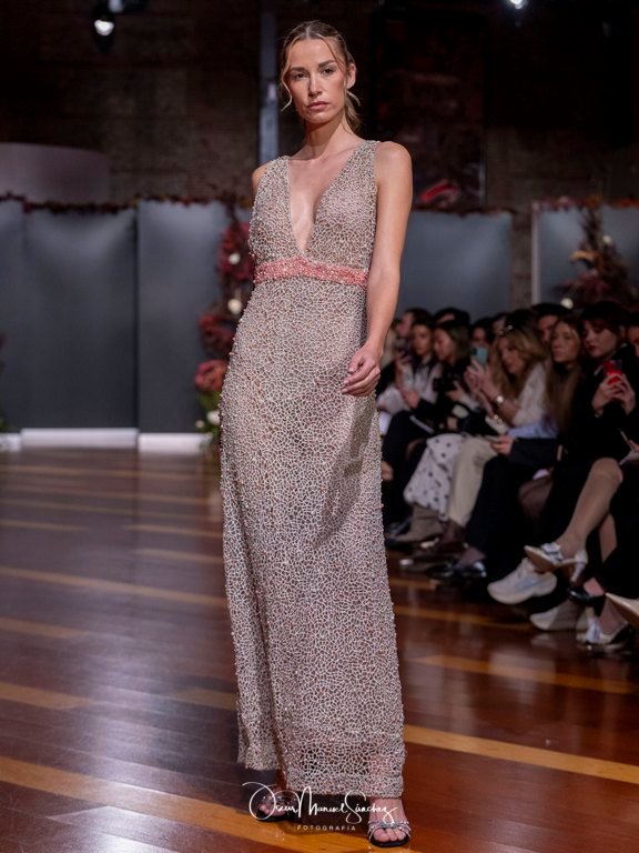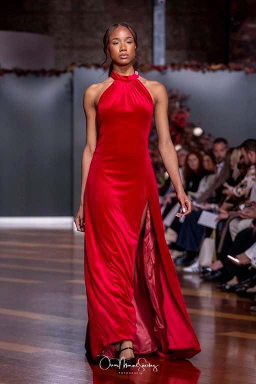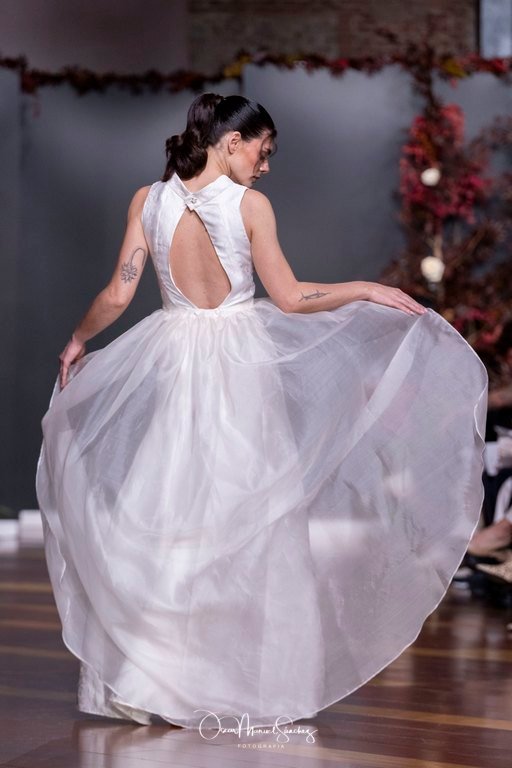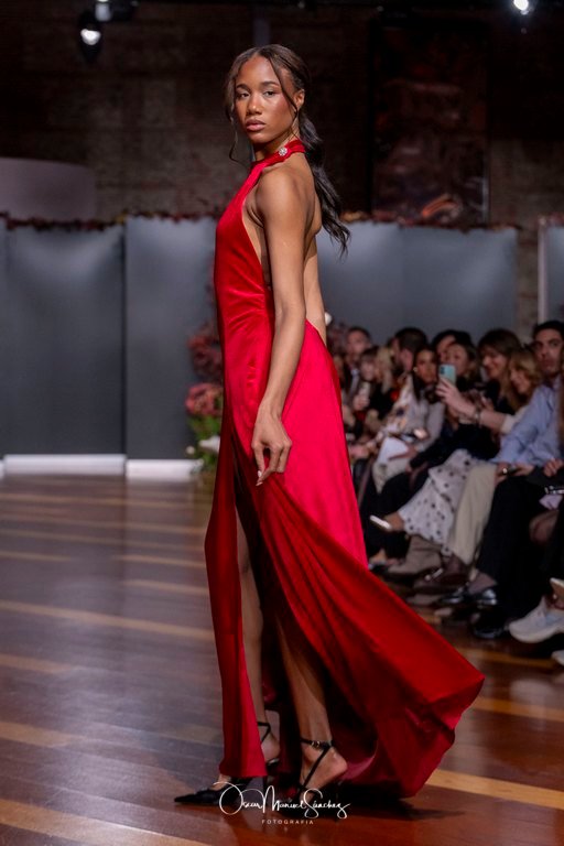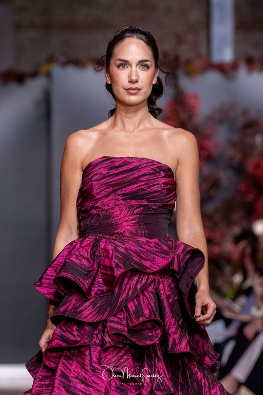Las siluetas, de carácter escultórico, abrazan el torso con precisión arquitectónica. Los cuerpos se pliegan estratégicamente, liberando hombros y espaldas en un juego de sensualidad controlada. Las faldas amplían su volumen para dibujar una reinterpretación contemporánea de la silueta reloj de arena, mientras las transparencias aportan movimiento y un halo de misterio.