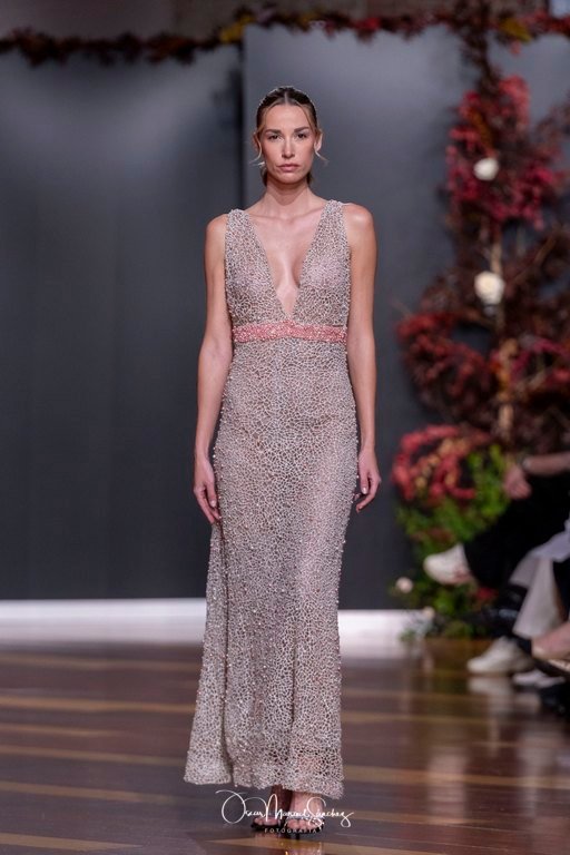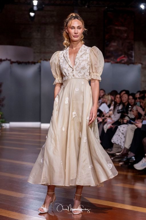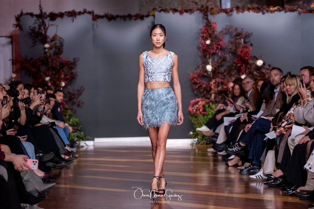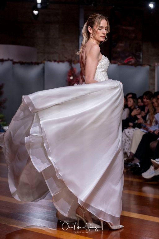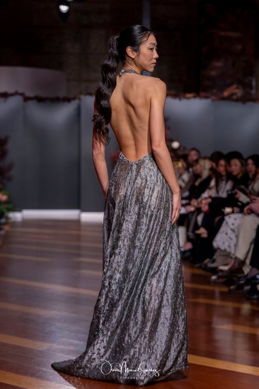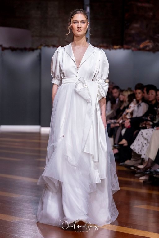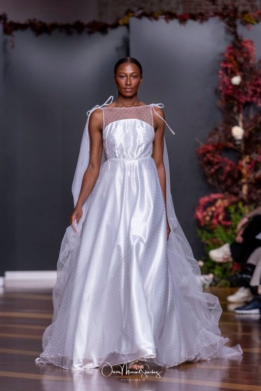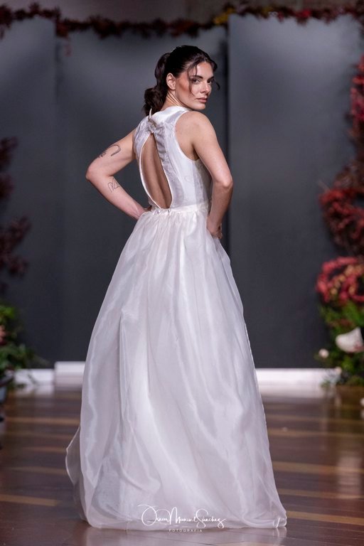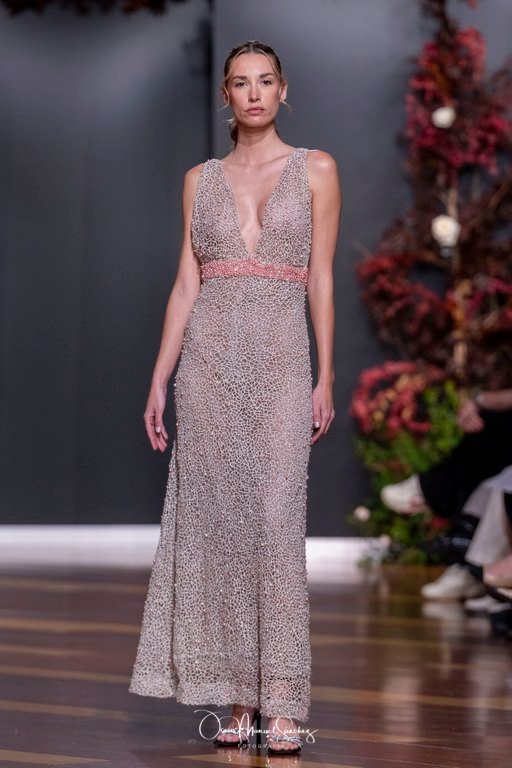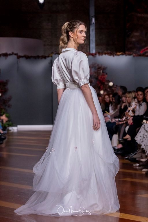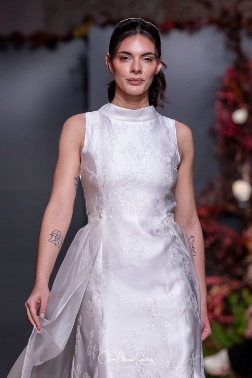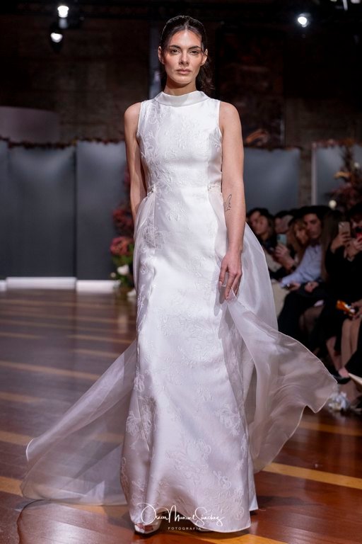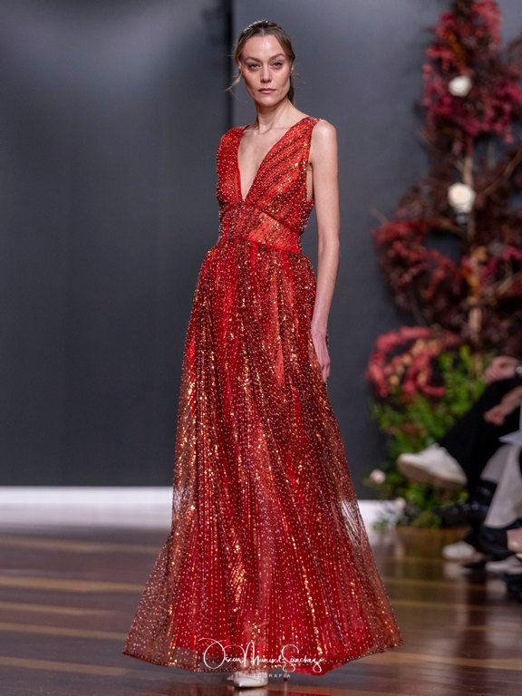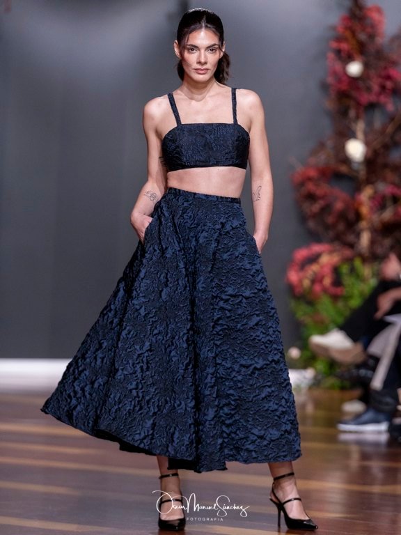 Las siluetas, de carácter escultórico, abrazan el torso con precisión arquitectónica. Los cuerpos se pliegan estratégicamente, liberando hombros y espaldas en un juego de sensualidad controlada. Las faldas amplían su volumen para dibujar una reinterpretación contemporánea de la silueta reloj de arena, mientras las transparencias aportan movimiento y un halo de misterio.