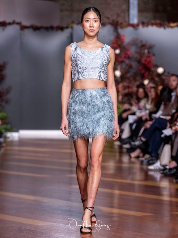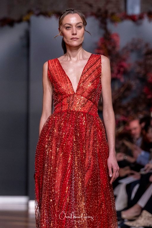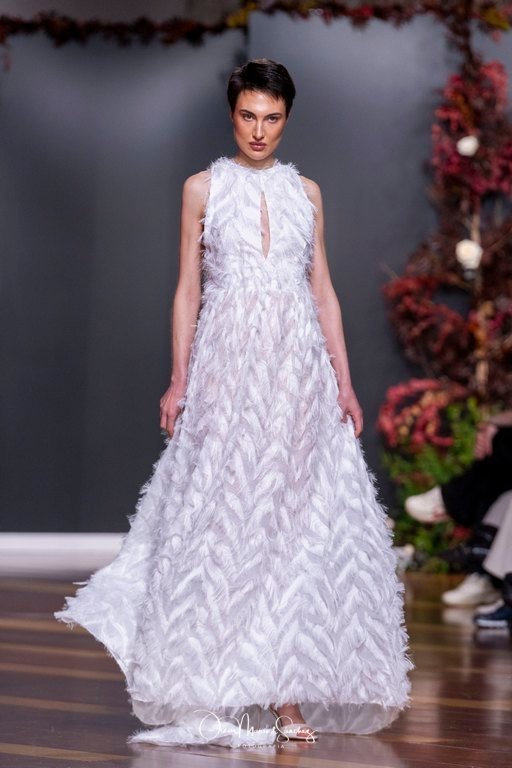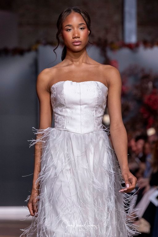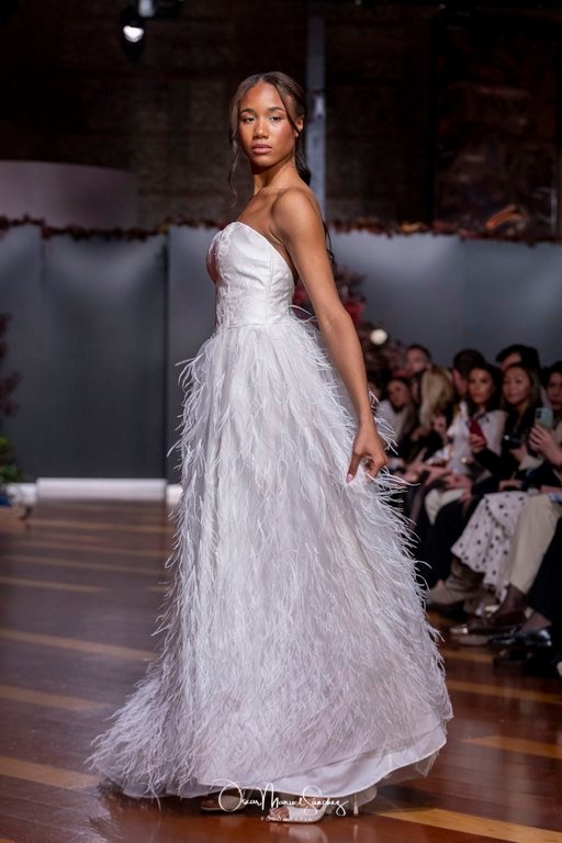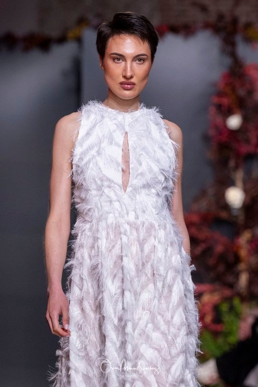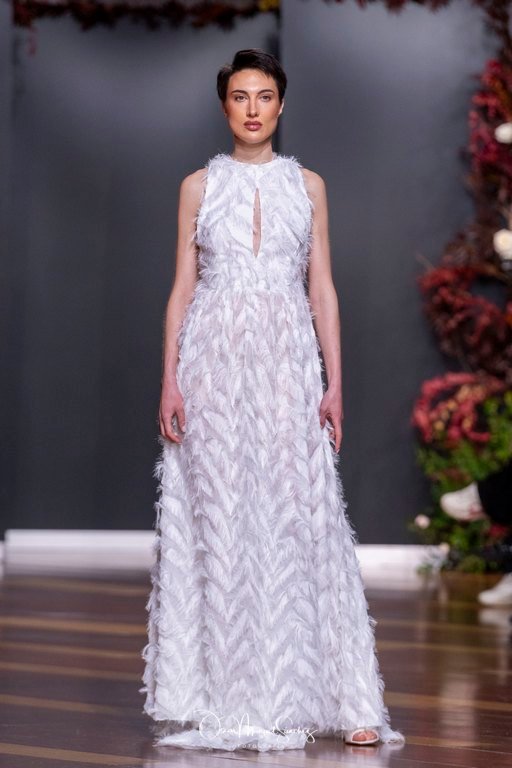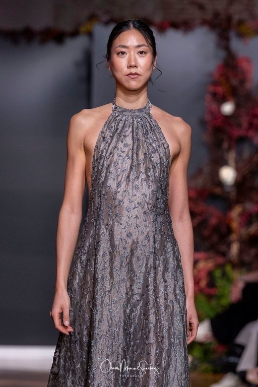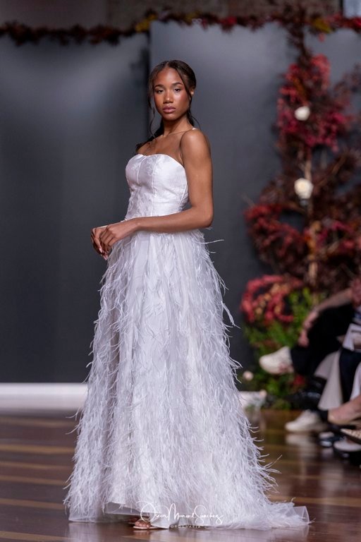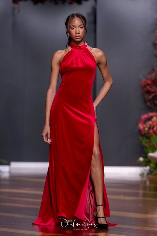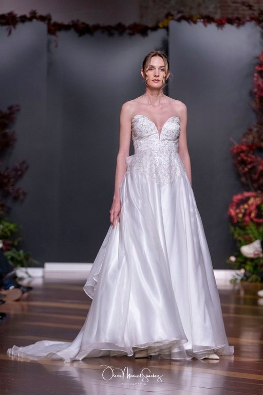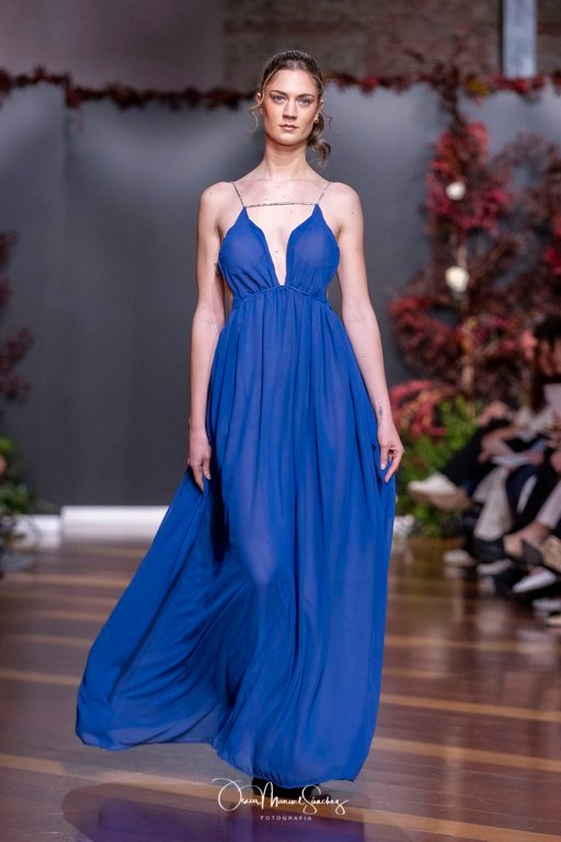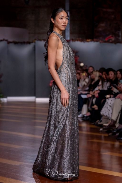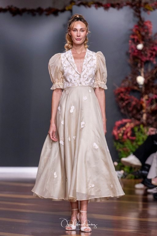 Las siluetas, de carácter escultórico, abrazan el torso con precisión arquitectónica. Los cuerpos se pliegan estratégicamente, liberando hombros y espaldas en un juego de sensualidad controlada. Las faldas amplían su volumen para dibujar una reinterpretación contemporánea de la silueta reloj de arena, mientras las transparencias aportan movimiento y un halo de misterio.