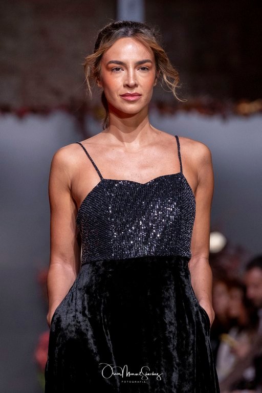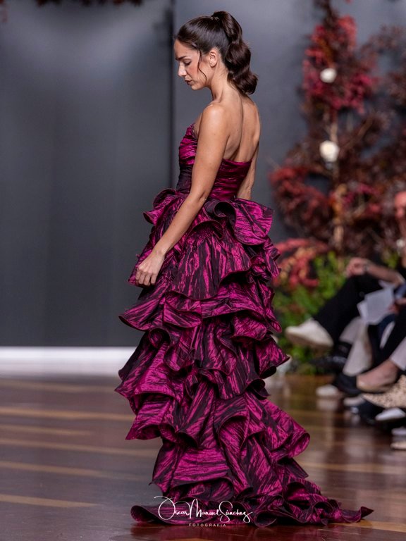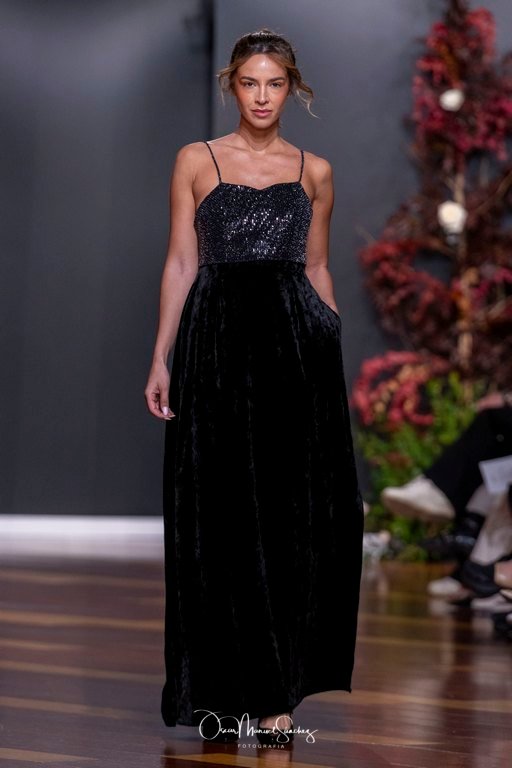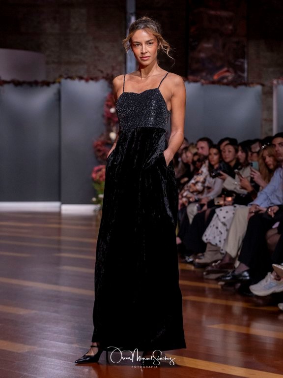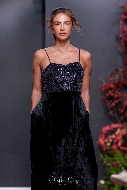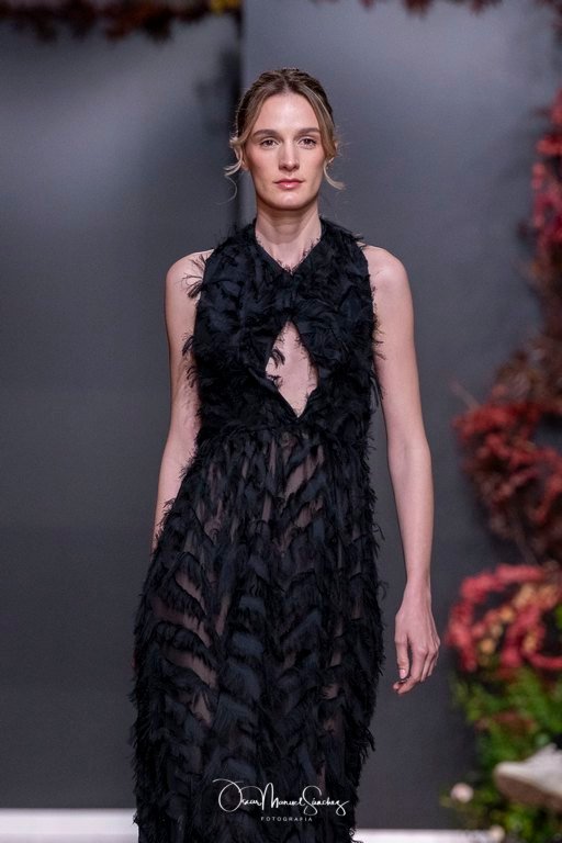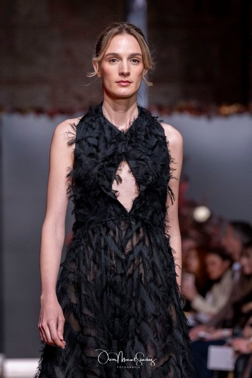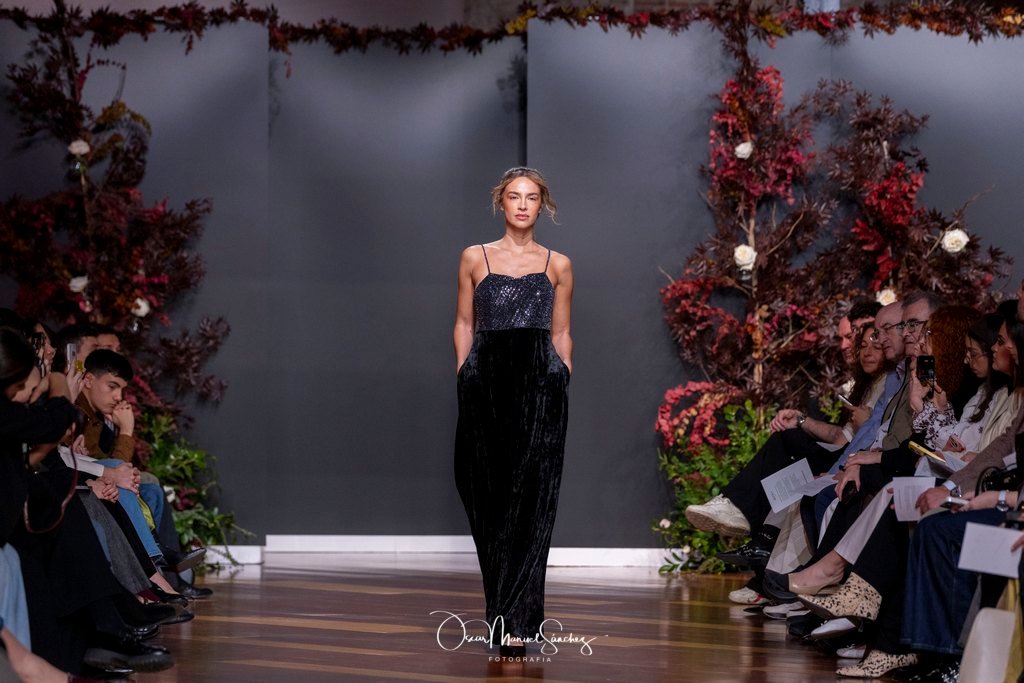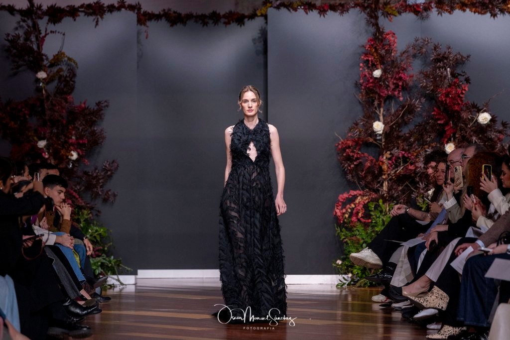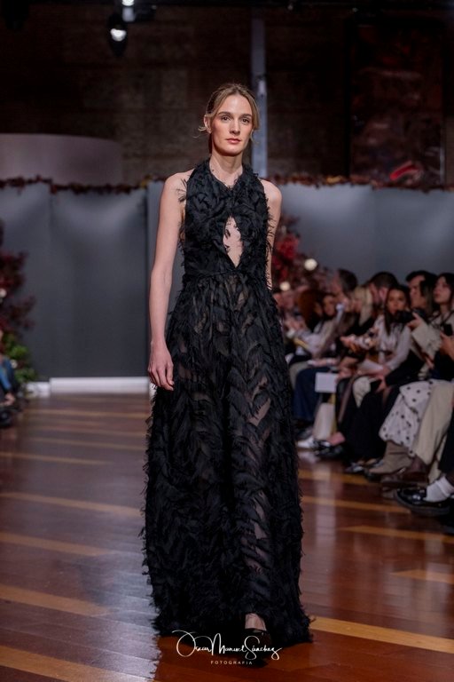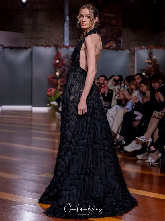 Los tejidos (terciopelo de seda, organza plisada, tafetán moiré, gasa vaporosa y redes de cristal) dialogan con bordados tridimensionales y abalorios azabache que capturan la luz en cada giro. Cada pieza es un ejercicio de precisión, un homenaje a cuatro décadas de savoir-faire que define a la casa Laguna.